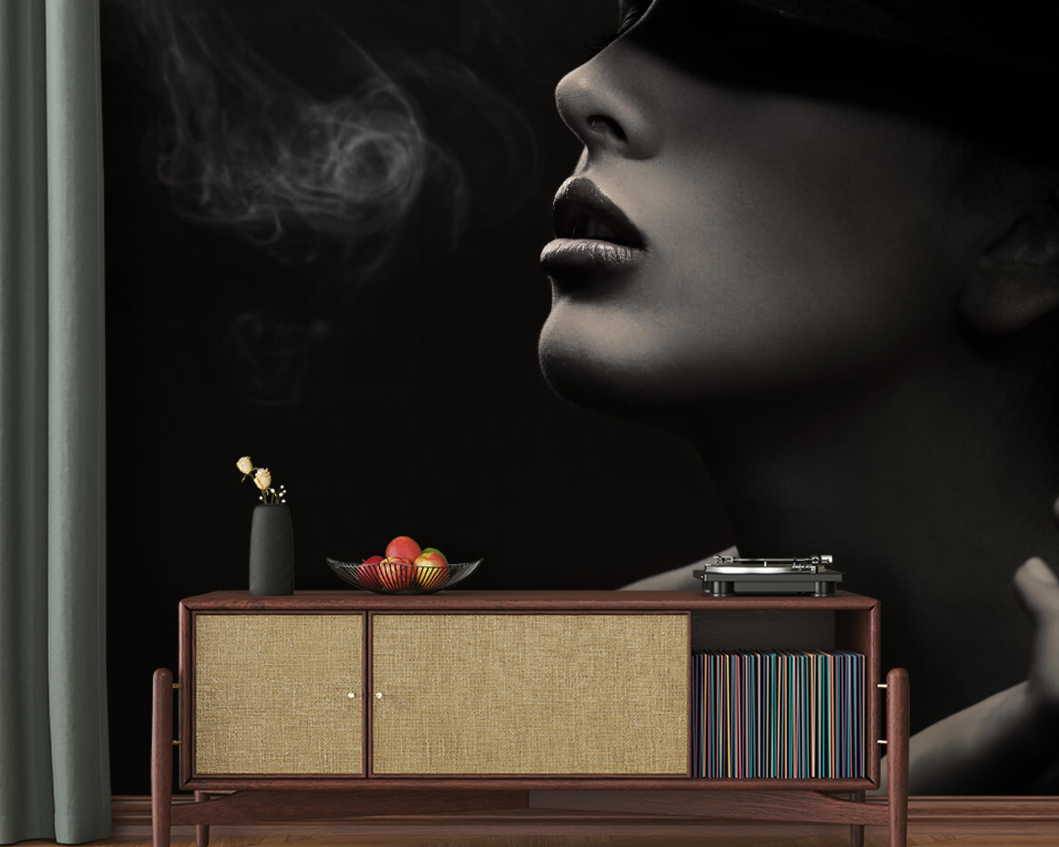 Proměňte svůj prostor v umělecké útočiště díky této úchvatné nástěnné malbě ženy v klobouku, která nedbale kouří. Je to jako vstoupit do stylové kavárny, kde každý kout šeptá eleganci a intriky. Způsob, jakým se dívá do dálky, obklopena vírem kouře, dodává nádech tajemna – ideální pro vyvolání zajímavých rozhovorů.