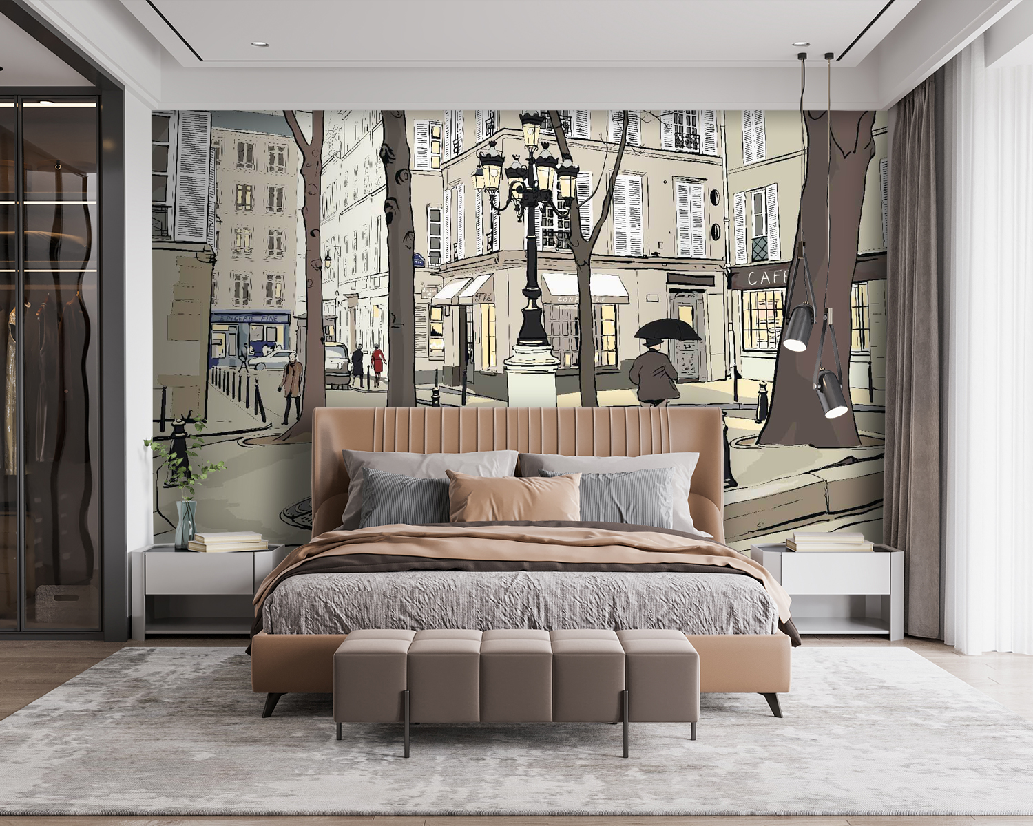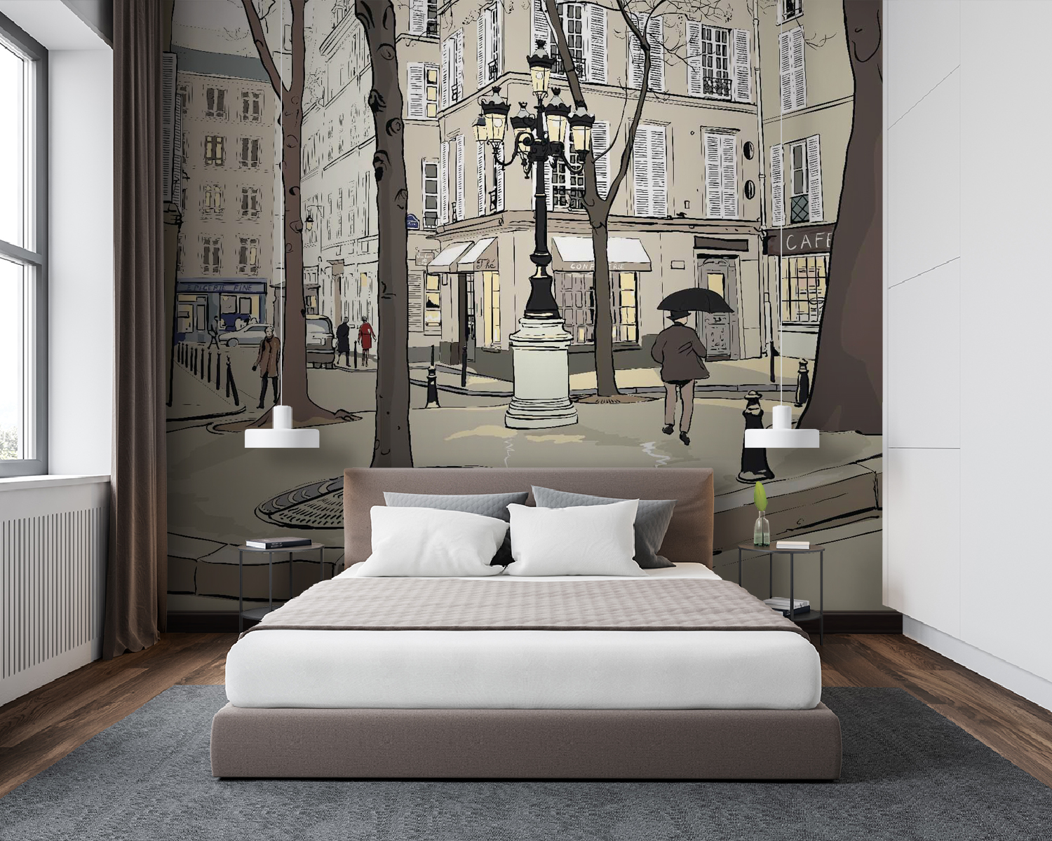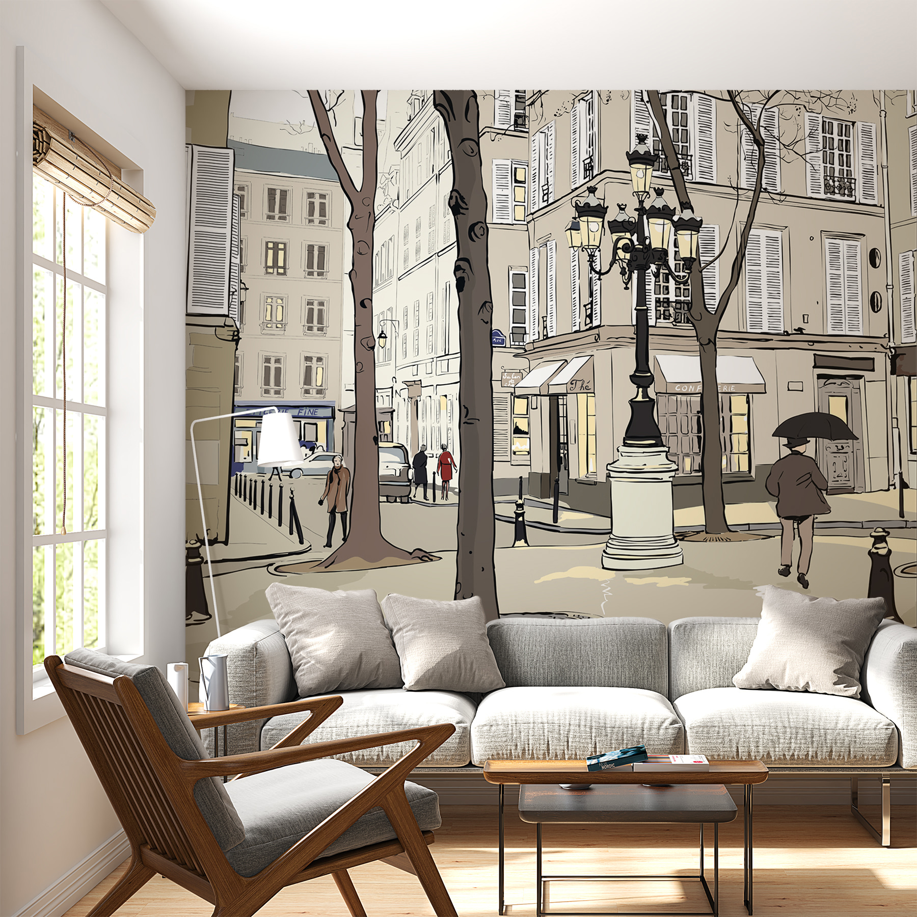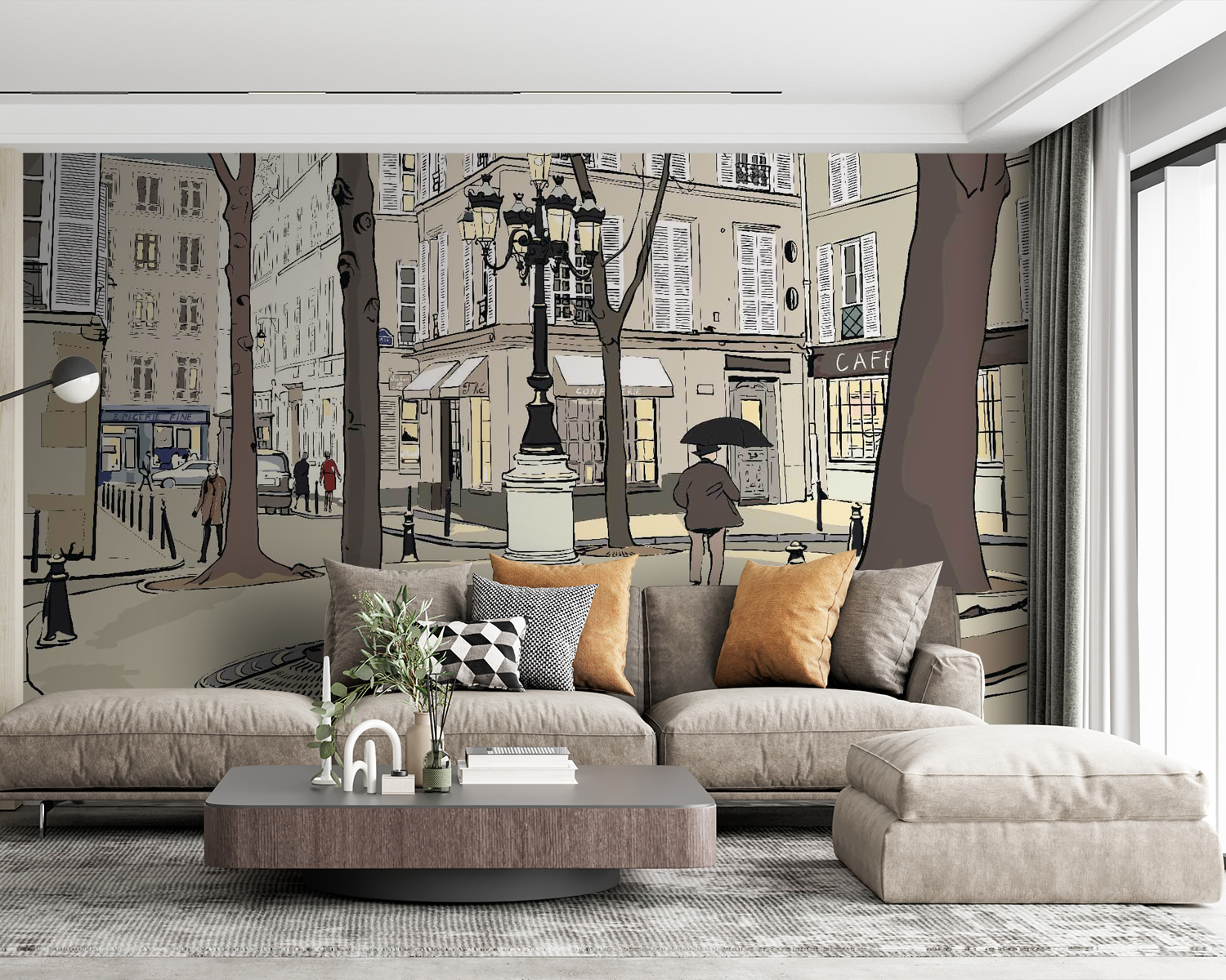 Proměňte obyčejnou zeď v živou scénu pomocí této náladové nástěnné malby, která zachycuje podstatu městského života. Představte si, jak se procházíte po okouzlující ulici lemované vysokými stromy a malebnými kavárnami, kde každý pohled odhaluje něco rozkošného. Jemná paleta barev přináší útulnou atmosféru, takže je ideální pro obývací pokoj nebo kreativní prostor. Představte si ranní kávu s tímto pozadím nebo hravou atmosféru v dětském pokoji. Je to jako pozvat do svého domova malý kousek města – vtipný, hřejivý a plný příběhů. Je to víc než jen nástěnná malba; je to zážitek, který čeká na rozvinutí s každým společným okamžikem.