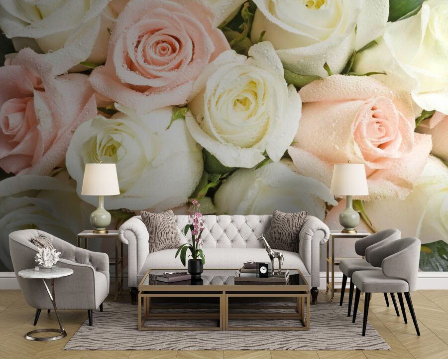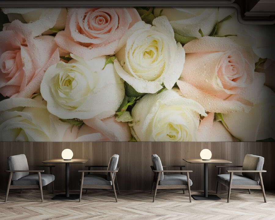 Proměňte svůj prostor pomocí této úchvatné tapety s nádhernou kombinací růžových a bílých růží. Představte si, že vstoupíte do místnosti a uvítá vás záplava květinového kouzla, jako byste byli na zahradní párty – a to bez nutnosti zalévání! Jemné odstíny navozují pocit uvolnění, zatímco krásné kapky deště na okvětních lístcích přinášejí osvěžující nádech. Ideální pro útulný koutek na čtení nebo živý obývací pokoj, jako byste měli krásu přírody na dosah ruky. Kdo by se neusmál při pohledu na tak veselý výjev? Je čas přivést venkov dovnitř a nechat ty růže působit svou magií!