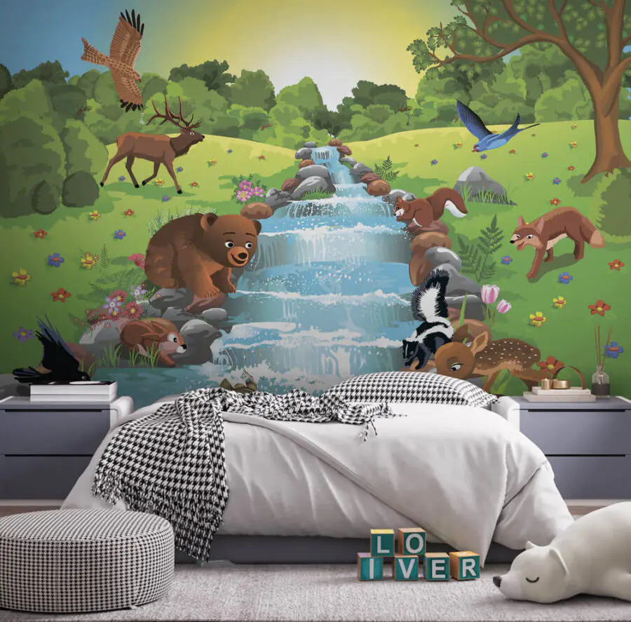 Transform your space into a lively woodland with this charming wall mural featuring quirky animal friends enjoying a sunny day by a sparkling stream. Imagine a bear splashing in the water, a curious deer bending down for a drink, and a cheeky squirrel plotting its next snack. This mural brings a sense of joy and warmth, perfect for family rooms or play areas—it’s like having a mini wildlife adventure right in your home! Every glance will remind you of simpler times, fresh air, and maybe even make you feel like jumping into the great outdoors. Embrace nature’s charm and let your walls tell a story!