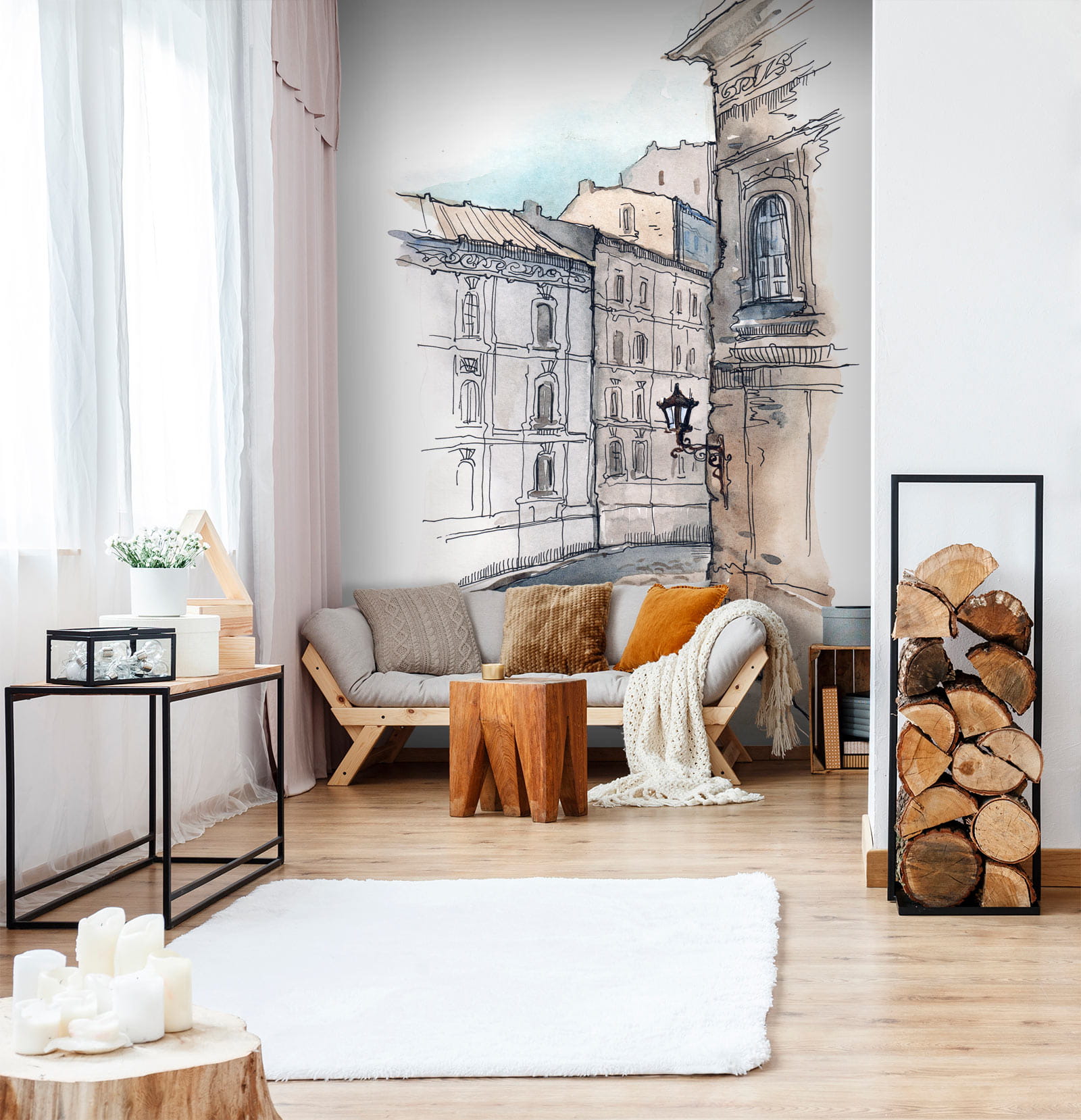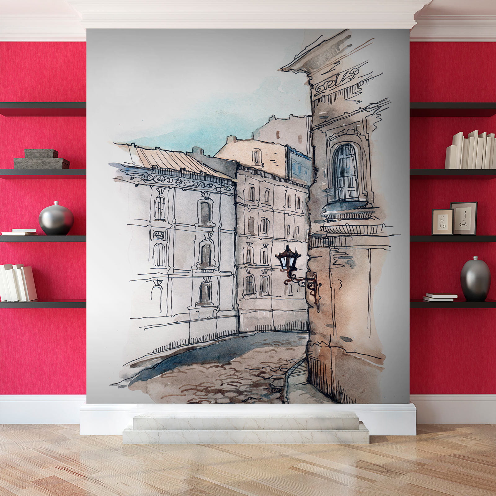 Tahle nástěnná malba je něco zvláštního, že? “Kresba budovy” má krásné kouzlo jako tichá procházka malebnou dlážděnou ulicí ve starém evropském městě. Styl akvarelu dodává jemný, nostalgický nádech, téměř jako by scéna sama jemně šeptala příběhy z minulých let.