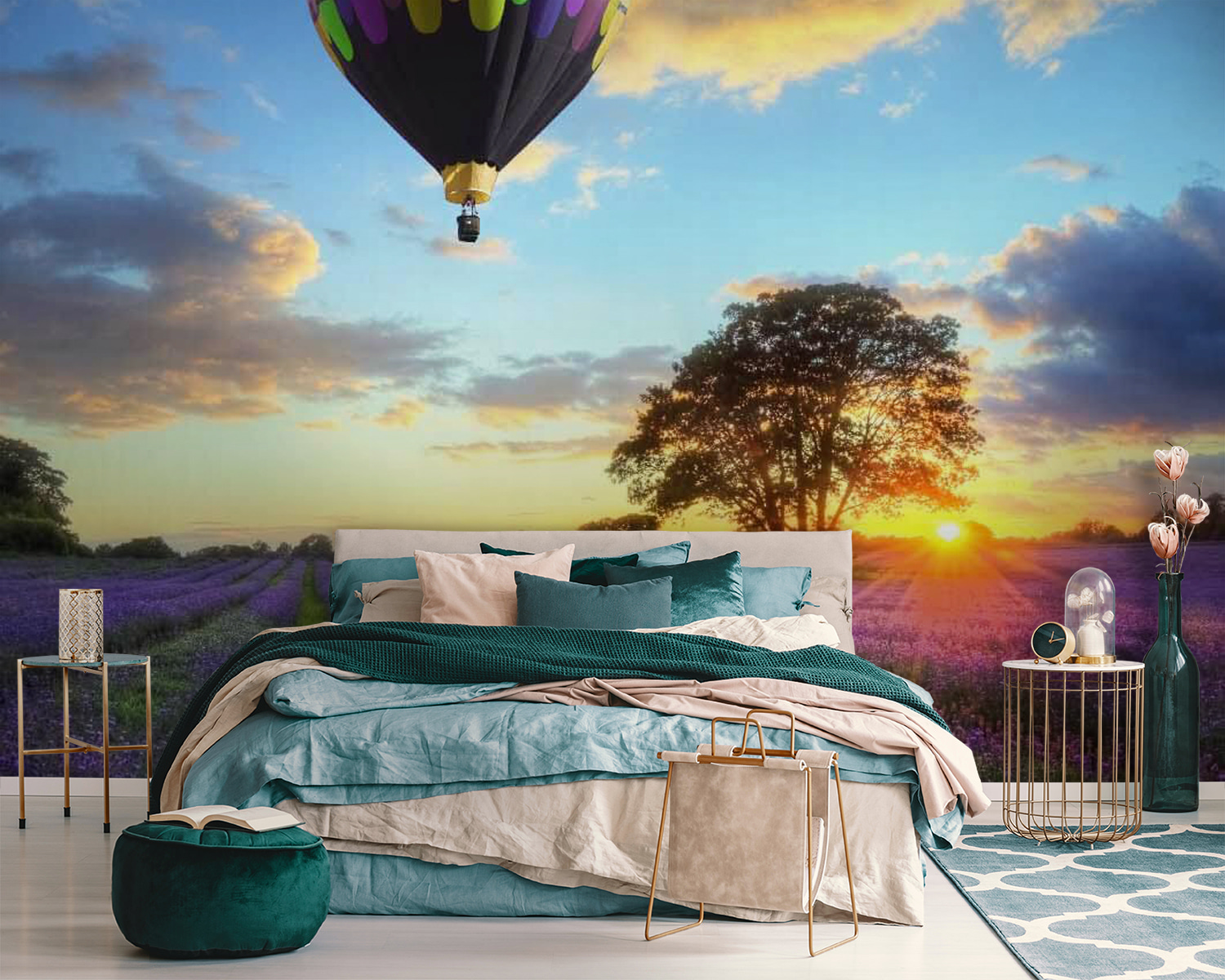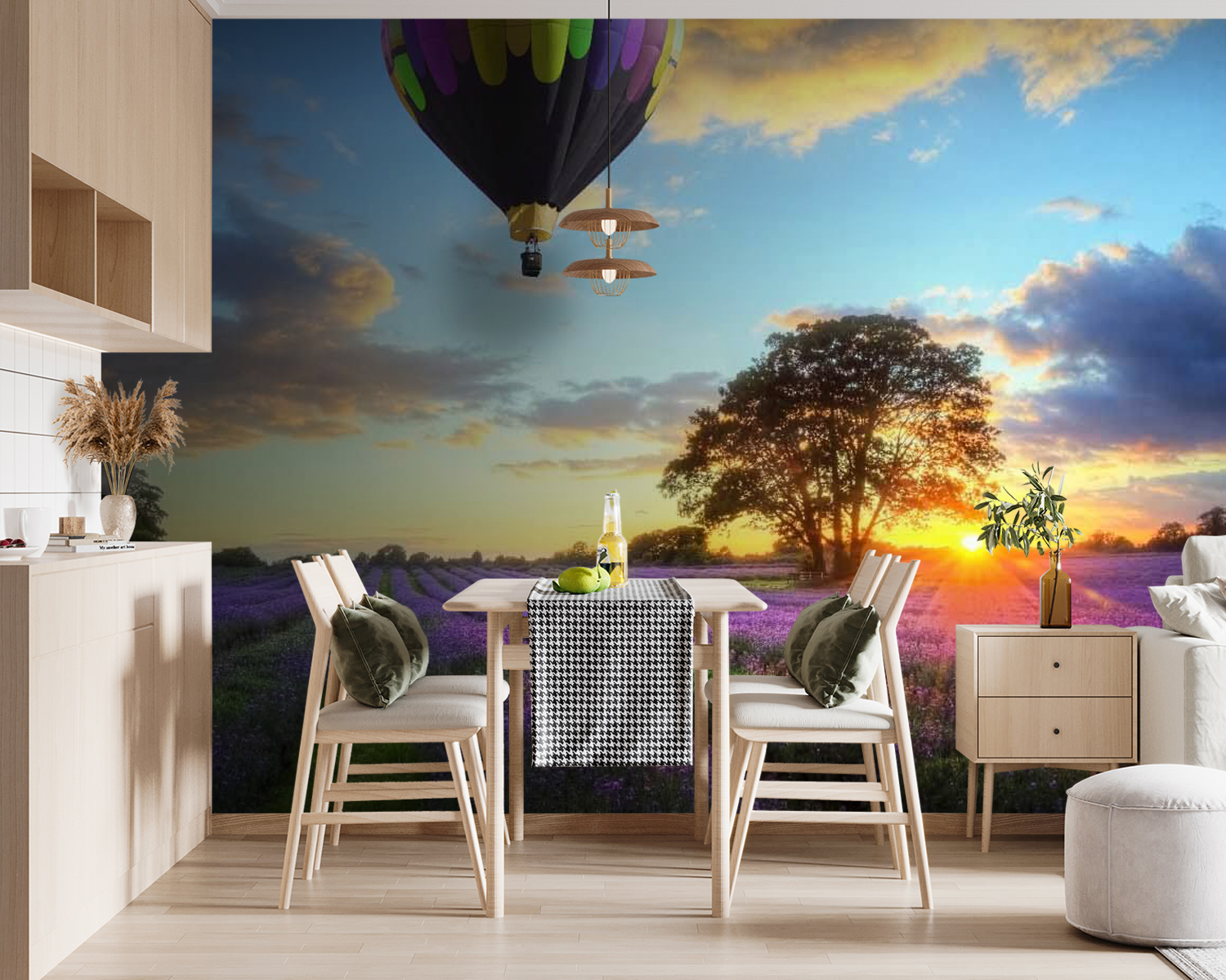 Picture this: a field bursting with vibrant lavender blooms, under a sky painted with the warm hues of sunset. And there, floating gracefully above it all, a group of whimsical hot air balloons, like candy-colored dreams taking flight. This mural doesn’t just decorate—it invites everyone to daydream and escape into a serene world. Imagine walking into your space and feeling a gentle breeze of calm wash over you, as if you’ve stepped into your own peaceful retreat. It’s like having a mini-vacation right on your wall! Perfect for any room needing a dose of cheer, it whispers soft tales of adventure and the beauty of nature. Ideal for those who love flowers, sky gazing, or just a bit of magic in everyday life. Who wouldn’t want to drift away on a colorful balloon ride over a sea of lavender?