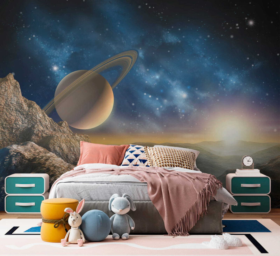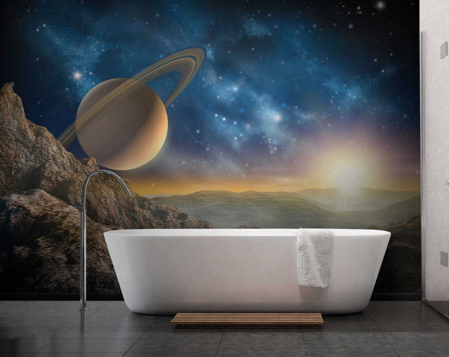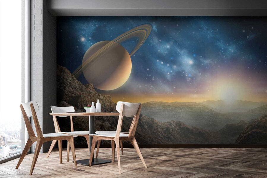 Proměňte obyčejnou zeď v nebeský únik s „nástěnnou malbou Planeta s prstenci na obloze“. Tato ohromující nástěnná malba vás přenese do snové krajiny, kde se majestátní hory setkávají s úchvatnou planetou zdobenou pohádkovými prstenci. Představte si, jak se uvelebíte v obývacím pokoji, kde dopadají paprsky ranního slunce a vrhají teplé světlo na tuto kosmickou scénu. Je to, jako byste měli kousek vesmíru přímo u sebe doma! Přátelé budou vcházet a údivem otevřou ústa, zatímco vy budete nenuceně popíjet čaj a cítit se jako mezihvězdný průzkumník. Ideální pro každého, kdo rád pozoruje hvězdy nebo jen chce ve svém prostoru vyvolat kosmickou inspiraci – to je skvělý námět k rozhovoru!