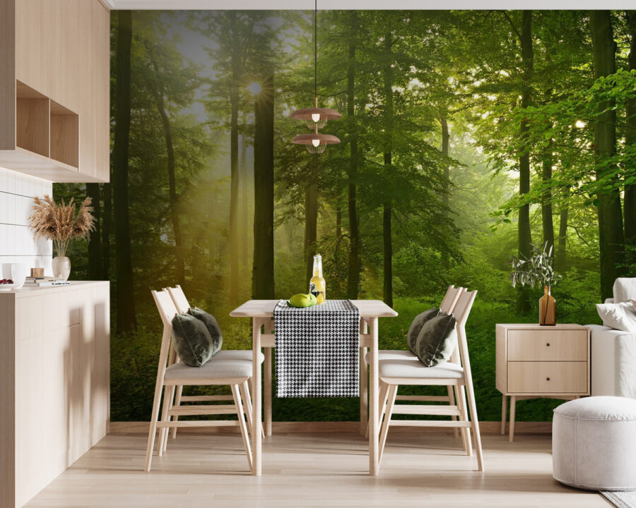 Proměňte svůj prostor pomocí této okouzlující nástěnné malby, která vnese klid prosluněného lesa přímo k vám domů. Představte si, jak jemné paprsky pronikají skrz svěží zelené listy a vytvářejí hřejivou, příjemnou atmosféru, díky níž budete mít pocit, že jste vstoupili do přírody. Tento kousek nejen dodává barvu, ale vdechuje místnosti život a vyvolává sny o lesních toulkách.