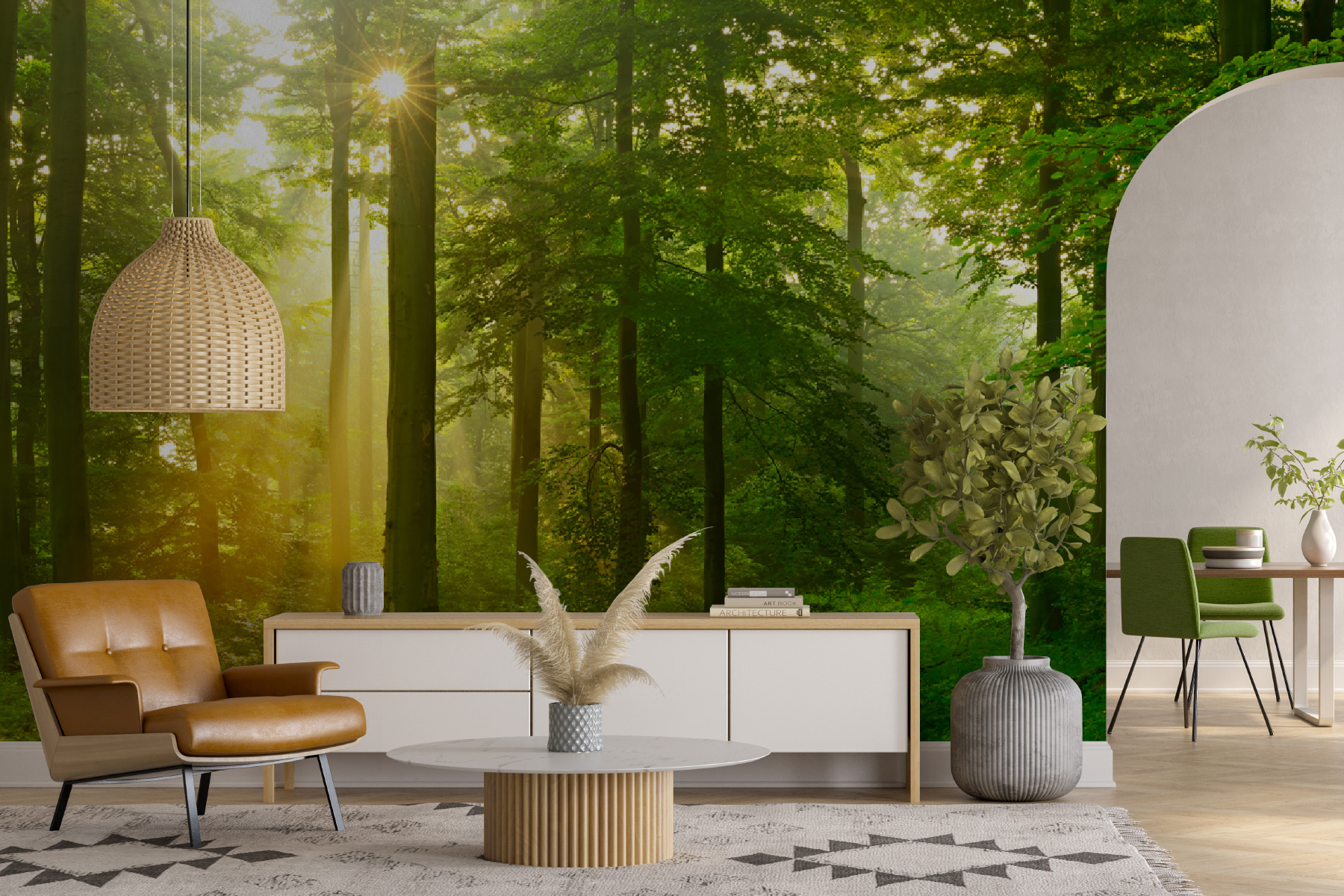 Proměňte svůj prostor pomocí této okouzlující nástěnné malby, která vnese klid prosluněného lesa přímo k vám domů. Představte si, jak jemné paprsky pronikají skrz svěží zelené listy a vytvářejí hřejivou, příjemnou atmosféru, díky níž budete mít pocit, že jste vstoupili do přírody. Tento kousek nejen dodává barvu, ale vdechuje místnosti život a vyvolává sny o lesních toulkách.