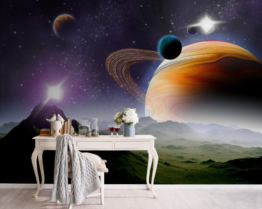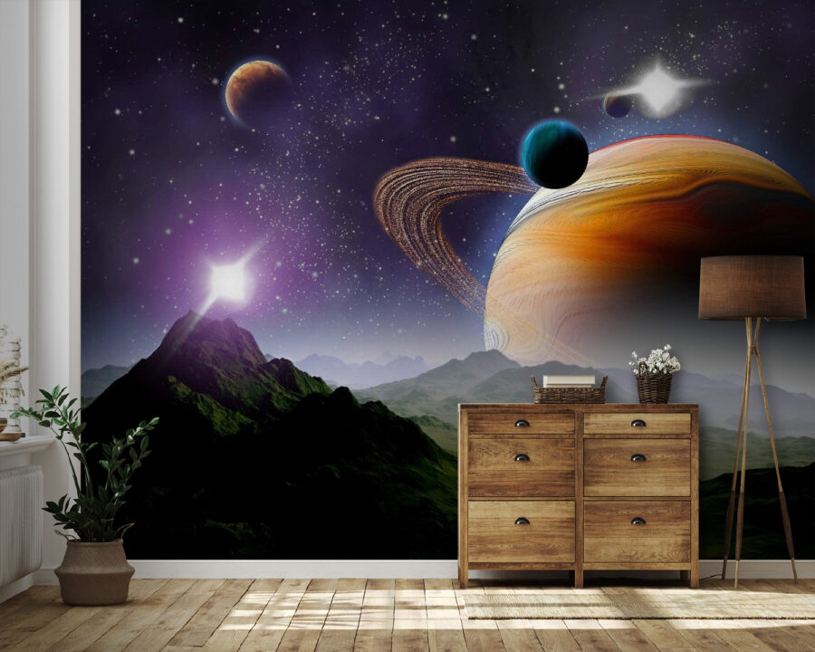 Proměňte svůj prostor v kosmický únik s touto úžasnou nástěnnou malbou s planetami a hvězdami v rozlehlém vesmíru. Představte si, že vstoupíte do galaxie, kde se barvy střetávají v tanci zářivých odstínů a jemných vírů. Tato fototapeta nejen zdobí stěny, ale podněcuje představivost a nádech toulek. Představte si, jak se choulíte s knihou, ztrácíte se v příběhu a vesmír vás obklopuje. Nebo možná inspiruje k hlubokým rozhovorům o životě, snech a o tom, co je tam venku. Hodí se do každé místnosti a je dokonalým začátkem konverzace – kdo by si nechtěl při popíjení kávy povídat o mezihvězdných dobrodružstvích? Není to jen nástěnná malba, je to brána do vesmíru přímo u vás doma!
