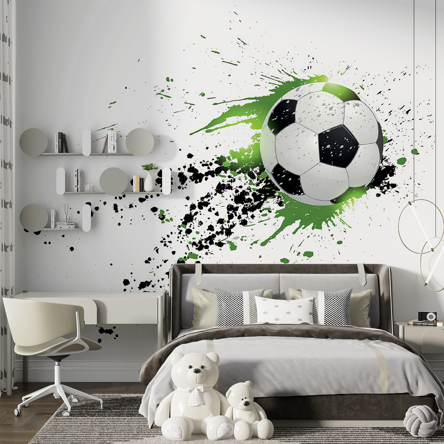 Ahoj! Představte si to – šplouchání barev a létající fotbalový míč přímo na vaší zdi. Přesně to získáte s nástěnnou malbou “Fotbalový míč s uměleckými cákanci”. Je to, jako by někdo zachytil dokonalý, akcí nabitý okamžik hry, zmrazil ho v čase a pak přidal trochu uměleckého vkusu. Zelené a černé cákance tomu dodávají takovou živou, zábavnou atmosféru. Pokoj vašeho dítěte by se okamžitě proměnil v pohodové sportovní útočiště. A upřímně, i kamarádi by vám ho mohli závidět! Při každém pohledu na něj prakticky uslyšíte jásot a ucítíte nadšení. Naprosto skvělé pro mladé fotbalové fanatiky, kteří sní o velkém úspěchu, že?