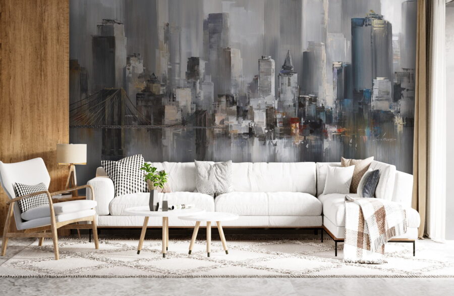 Představte si tuto scénu, která vás vítá každé ráno – zasněná městská krajina v tlumených barvách, které i v nejslunečnějším odpoledni navozují útulnou atmosféru deštivého dne. Tato nástěnná malba je jako okno do klidného, téměř magického města, kde se věže táhnou vzhůru, hledají mraky a drobné plachetnice jemně plují po klidných vodách. Je to ten druh umění, který vás nutí sednout si s šálkem čaje a ztratit se v myšlenkách. Skvěle se hodí do obývacího pokoje nebo kanceláře a do každého prostoru vnese klidný, ale živý nádech. Váš vlastní malý městský únik, žádný spěch, jen klid.