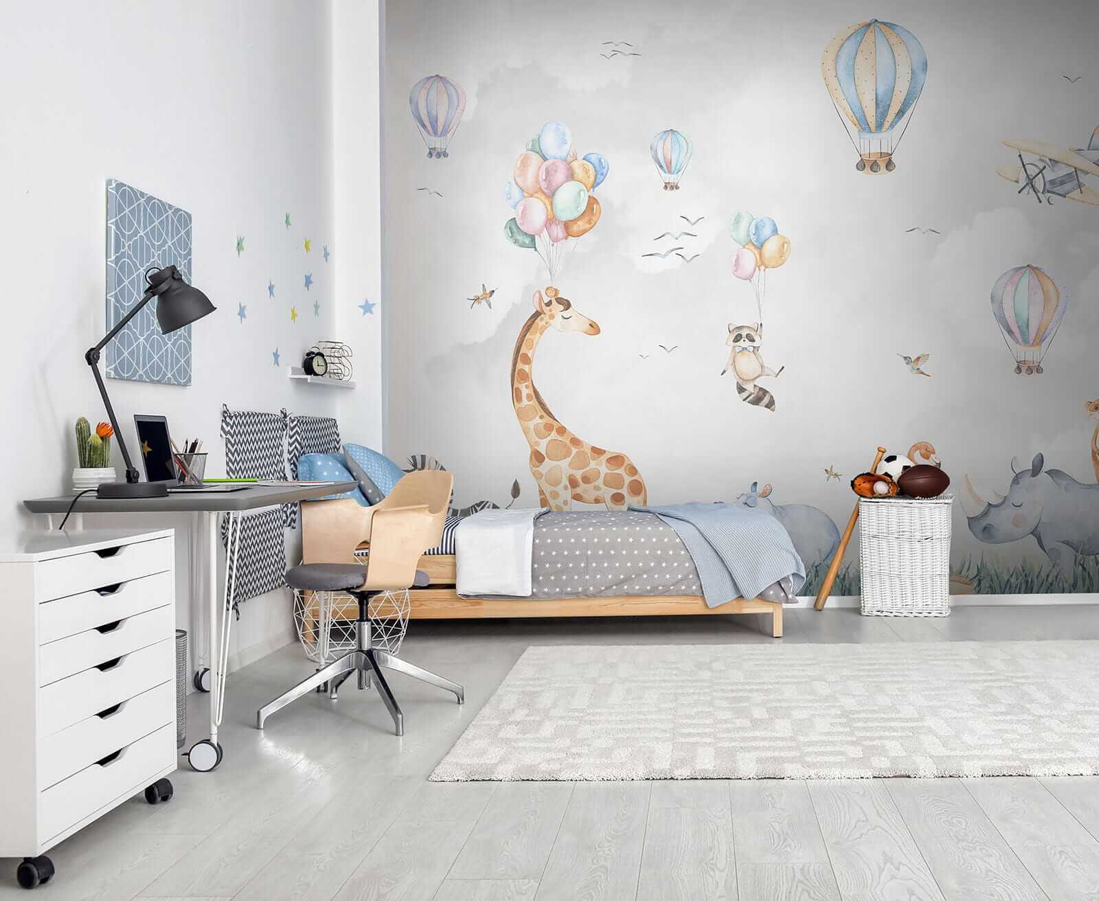Tady je trocha rozmarů pro prostor vašeho dítěte! Nástěnná malba “Hroch v trávě” je naprosto okouzlující. Představte si, že vejdete do pokoje a budete si připadat jako na kouzelném safari – vznášející se horkovzdušné balóny, zvířata jako žirafy a zebry, která se jen tak chladí na vysokých travnatých polích. Dokonce i drzý mýval držící balónky! Tato nástěnná malba přináší živou, hravou atmosféru, kterou děti – i dospělí – zbožňují. Skvěle se hodí do dětského pokoje, kde podněcuje fantazii a dobrodružství. Představte si, že příběhy před spaním mají zcela nové kulisy a každý večer se stane mini dobrodružstvím. A kdo by nechtěl mít v pokoji veselého hrocha? Určitě se s ním dá začít mluvit. Připravte se na óóó a ááá od malých (i velkých!) dětí. Není to jen dekorace, je to radost stříkající na zeď.