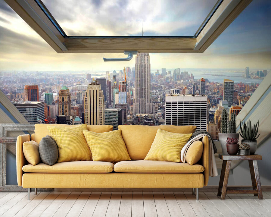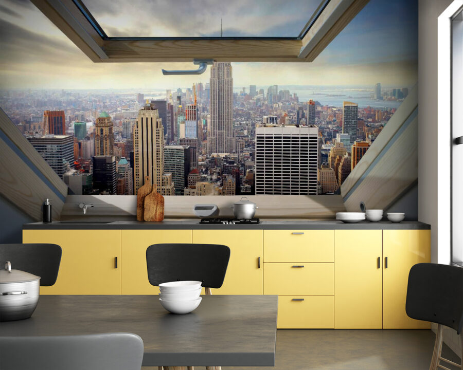 Představte si toto: slunečné ráno, jemný vánek proudící otevřeným oknem a panoramatický výhled na rušné město – to vše z pohodlí vašeho domova. To vše slibuje tato tapeta „Wall Murals Window with a View of a City“ (Tapety s výhledem na město). Dodává hloubku a energii každé místnosti a proměňuje jednoduchou zeď v živou scénu mrakodrapů sahajících až k oblakům.