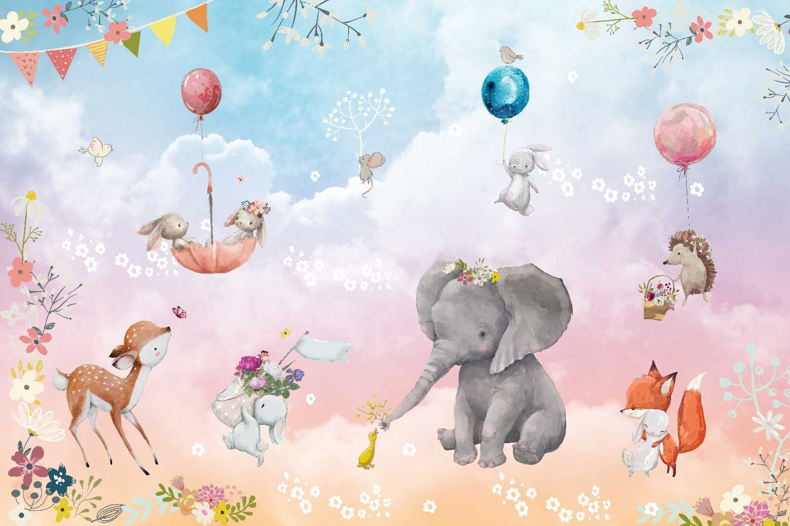 Proměňte svůj prostor pomocí této nádherné tapety s fantaskními zvířátky a veselými balónky. Představte si jemného slona, ozdobeného květinami, jak sdílí okamžik s hravými králíčky a zvědavým ježkem – všichni se vyhřívají pod snovou pastelovou oblohou. Je to jako scéna z kouzelné pohádkové knížky!