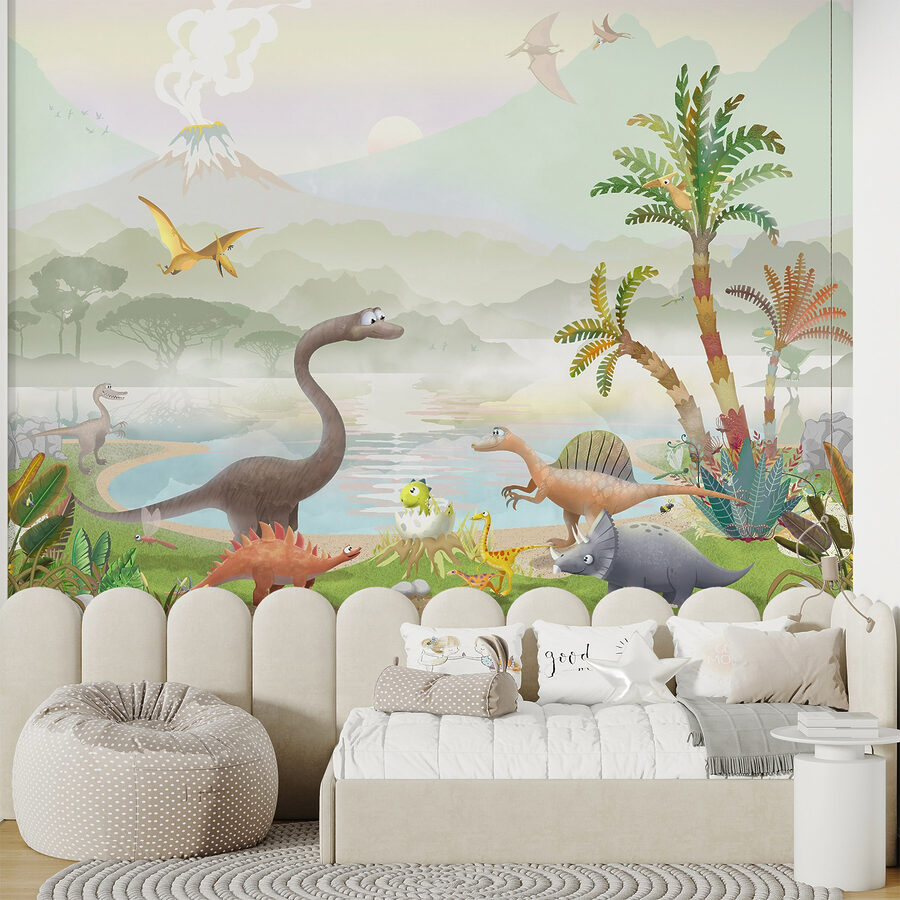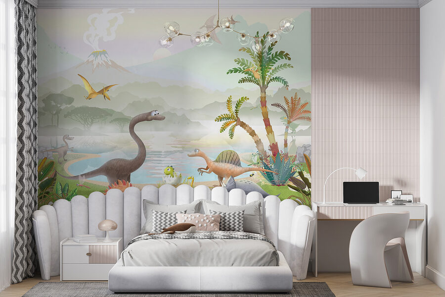 Hledáte něco, co rozzáří dětský pokoj? Podívejte se na tuto rozkošnou fototapetu s pterodaktylem, který létá vysoko nad kresleným světem dinosaurů. Představte si to: živí dinosauři se potulují kolem, bujné prehistorické rostliny a v pozadí dýmající sopka – je to jako vstoupit do barevného stroje času! Děti si zamilují ukazování svých oblíbených dinosaurů a předstírání, že létají spolu s pterodaktylem. Je ideální pro rozvíjení fantazie a přidání zábavného barevného nádechu do každého pokoje. Budete nejúžasnějším rodičem v bloku!