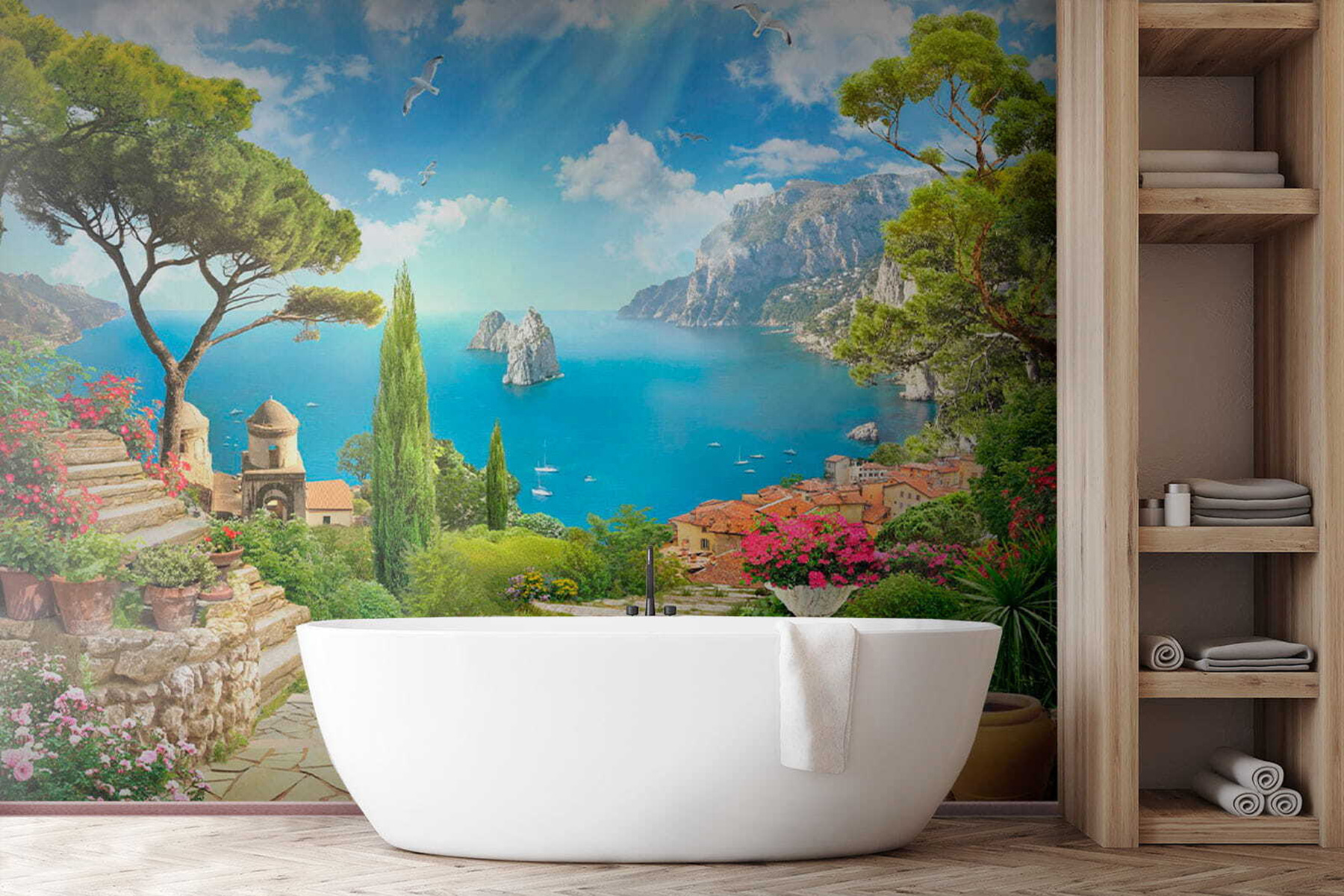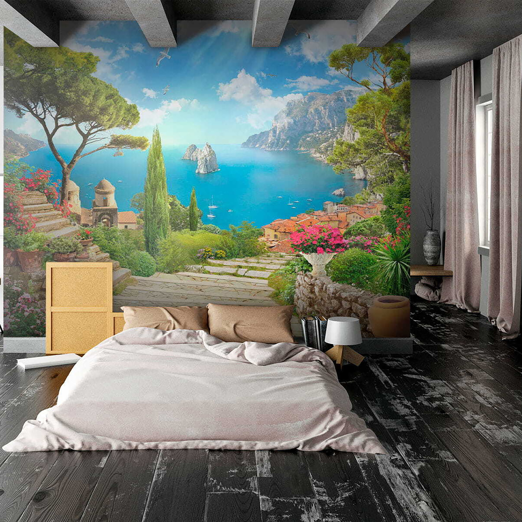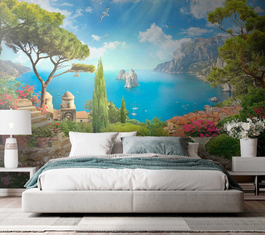 Představte si to: vcházíte do obývacího pokoje, ale počkejte – místo toho vás přivítá nádherný výhled na moře. S nástěnnou malbou “Pták letící v oblacích” se vaše stěny pořádně rozzáří. Je to jako přidat okno s výhledem přímo na Středozemní moře s nádechem fantazie. Představte si živou zeleň, okouzlující kamenné cestičky a vysoko vzlétající ptáky.