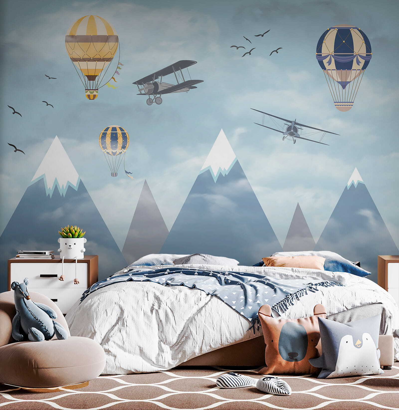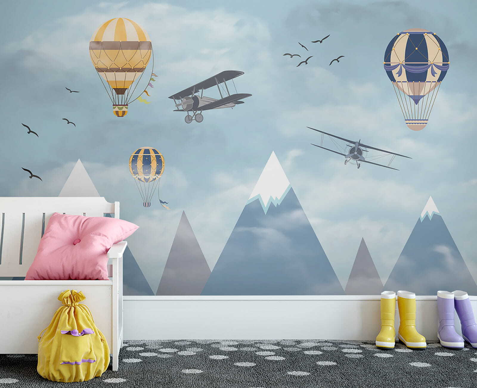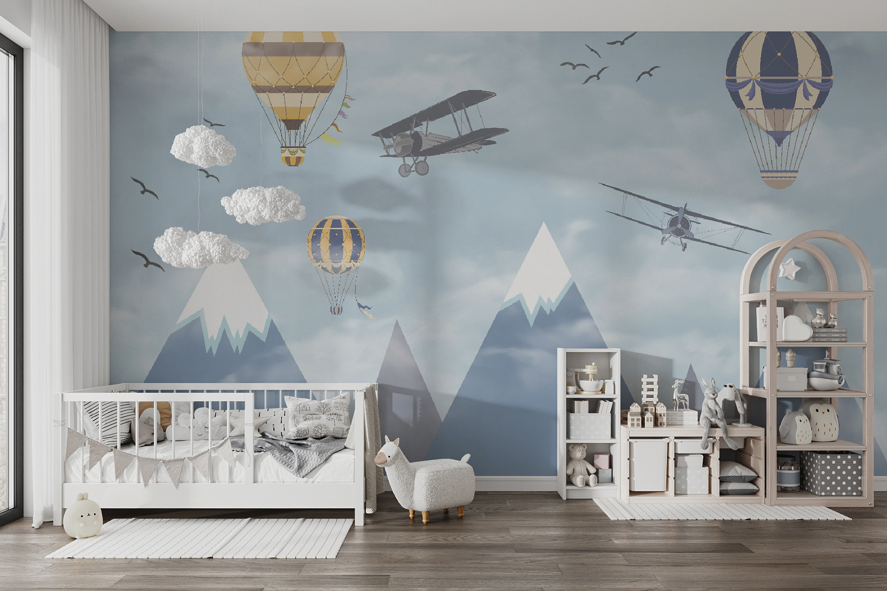 Představte si, že se probudíte na obloze plné rozmarných horkovzdušných balonů plujících mezi mraky, vedle nich prolétávají dobrodružná letadla a vysoko se vznášejí ptáci – je to čiré kouzlo! Nástěnná malba “Horkovzdušný balón na obloze” vnese pocit zázraku a dobrodružství přímo do místnosti. Je ideální pro podnícení kreativity a snů v dětských prostorech, je to jako dát dětem plátno pro jejich fantazii, aby se vyřádily. Pastelová modř a jemné mraky působí uklidňujícím dojmem a dodávají prostoru pocit lehkosti a vzdušnosti. Není to jen dekorace – je to cesta do oblak, aniž byste museli opustit místnost. I rodiče mohou pocítit záchvěv nostalgie a vzpomenout si na sny o vzdálených místech a odvážných cestách. Kdo by nechtěl mít doma něco takového? Navíc ty zasněžené hory v pozadí? Jednoduše okouzlující. Tato nástěnná malba je v podstatě sněním v podobě nástěnného umění – nekonečně okouzlující a krásně klidná. Děti ji budou milovat a vy v sobě budete mít také dítě.