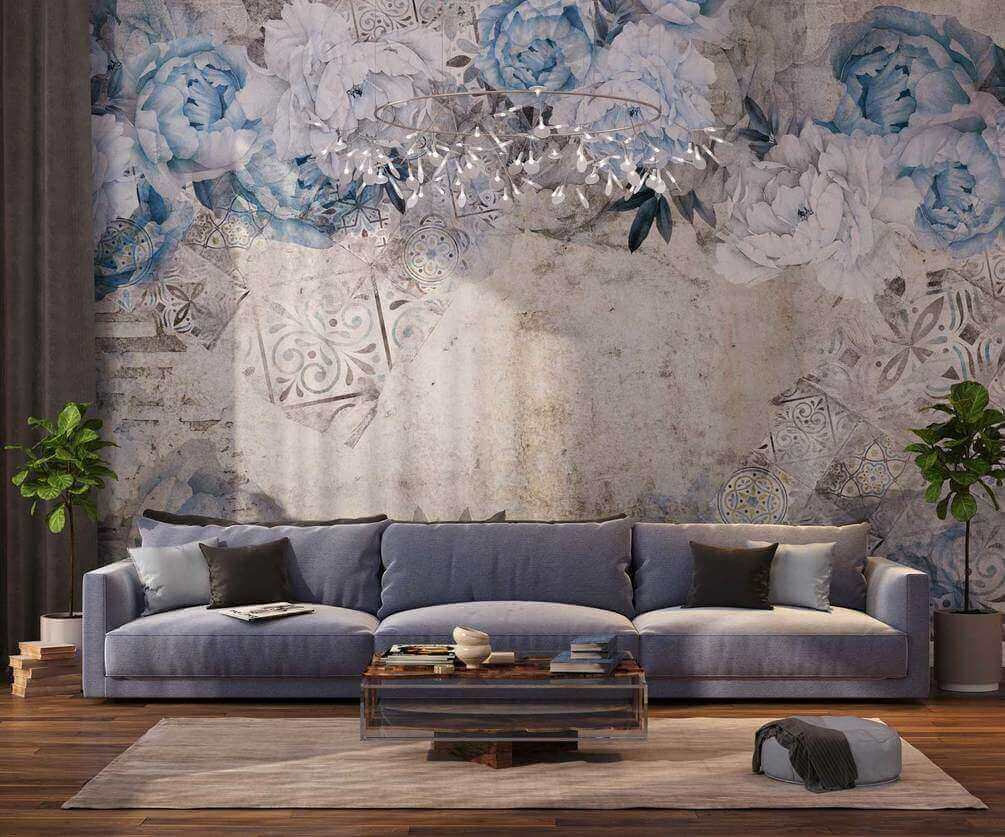 Fototapeta Modrý květinový vzor s vintage dlaždicemi. (SKU: u60497)