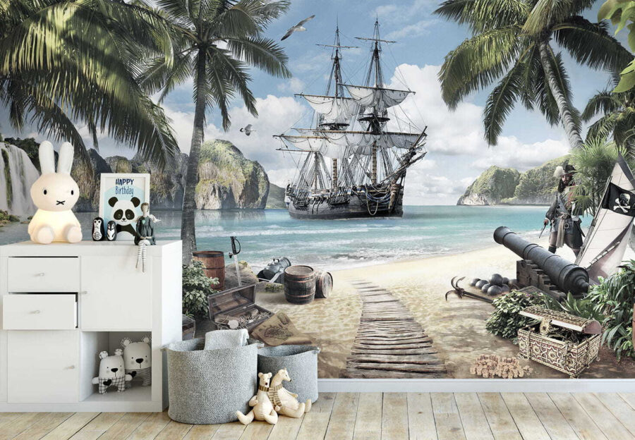Proměňte jakýkoli prostor ve sluncem políbený ráj s nástěnnou malbou “Pirátská loď ukotvená v tropickém ráji”. Představte si, že vstoupíte do světa, kde vám mořský vánek jemně čechrá tvář a nad vámi se pohupují živé palmy. Tato nástěnná malba oživuje úžasný výjev – dobrodružnou pirátskou loď zakotvenou u křišťálově čistých vod, obklopenou poklady a bujnou přírodou. Děti si budou připadat jako účastníci dobrodružné plavby, při které objevují skryté poklady a tajné ostrovy. Je to víc než jen dekorace; je to jiskra pro kreativitu, inspirující příběhy a nekonečné snění. Kdo by nechtěl odplout pokaždé, když se podívá na svou zeď? Tato nástěnná malba je ideální do dětských pokojů nebo ložnic a vytváří okouzlující únik, který jistě vykouzlí úsměv na tváři každému. Nechte fantazii vyplout na moře!