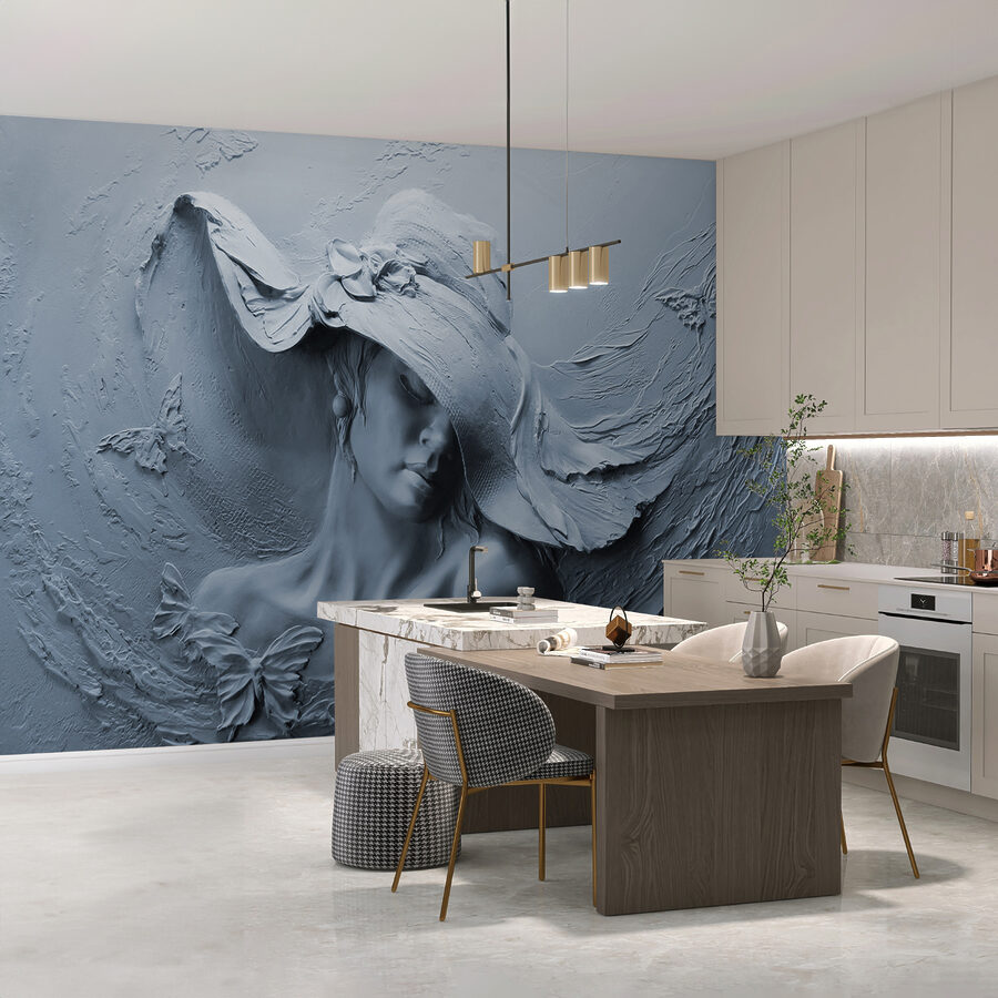 Proměňte svůj prostor pomocí této úchvatné nástěnné malby s klidnou sochou ženy v klobouku. Je to jako vnést do místnosti jemný vánek – okamžitě povznášející. Představte si, že se pohodlně usadíte se svou oblíbenou knihou a jemní motýli, kteří kolem ní víří, se zdají být téměř živí. Tento pozoruhodný kousek nepřidává jen vizuální zajímavost; vyvolává sny a příběhy. Ideální pro rozvíjení kreativity nebo třeba jen vyvolání úsměvu, když jdete kolem. Máte prázdnou zeď? Tato nástěnná malba je jako hřejivé objetí, lákavá a trochu tajemná. Ideální pro každého, kdo má rád jedinečný dekor, který promlouvá k duši.