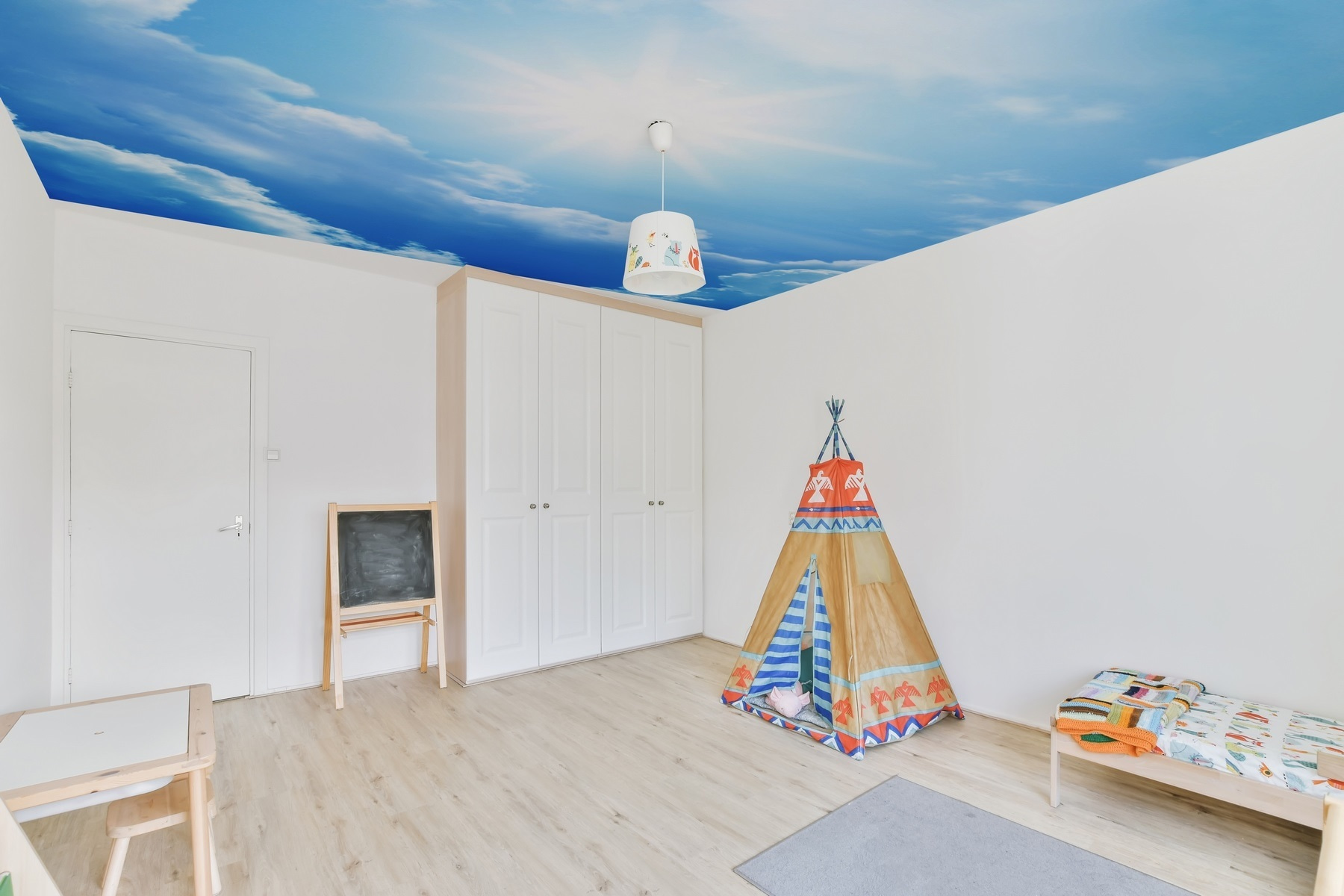 S touto okouzlující nástěnnou malbou modré oblohy poseté nadýchanými mraky a zářícím sluncem proměníte každou místnost v kousek venkovního prostředí. Je to jako mít okno do dokonalého dne – žádný déšť, žádný vítr, jen čisté blaho. Představte si, že se schoulíte do klubíčka s oblíbenou knihou, koupete se v této povznášející atmosféře nebo hostíte přátele, kteří mají okamžitě pocit, že vstoupili do slunečného útočiště. Není to jen dekorace, je to pozvánka k odpočinku a načerpání nových sil. Navíc může vyvolat sny o vzdálených plážích nebo líných odpoledních pod sluncem. Nástěnné malby, jako je tato, jsou ideální pro oživení nudných prostor. Je na čase nechat své stěny nadechnout trochu slunečních paprsků!