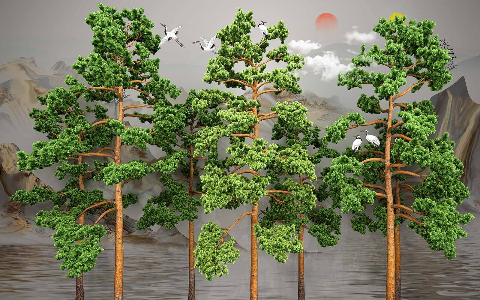 Proměňte svůj prostor pomocí této úchvatné nástěnné malby, na které je vyobrazena klidná skupina stromů a nad nimi kroužící elegantní ptáci. Je to jako vstoupit do klidného lesa, aniž byste opustili svůj obývací pokoj – kdo by potřeboval výlet do přírody? Představte si, jak hostíte přátele a oni žasnou nad tímto jedinečným pozadím. Živé zelené barvy vynikají na jemně tlumeném pozadí, takže se perfektně hodí do útulných koutků nebo dokonce na výrazné stěny. A ti ptáci? Dodávají nádech fantazie a svobody. Pokaždé, když kolem procházíte, pocítíte klid; je to jako kousek přírody přímo u vás doma.
