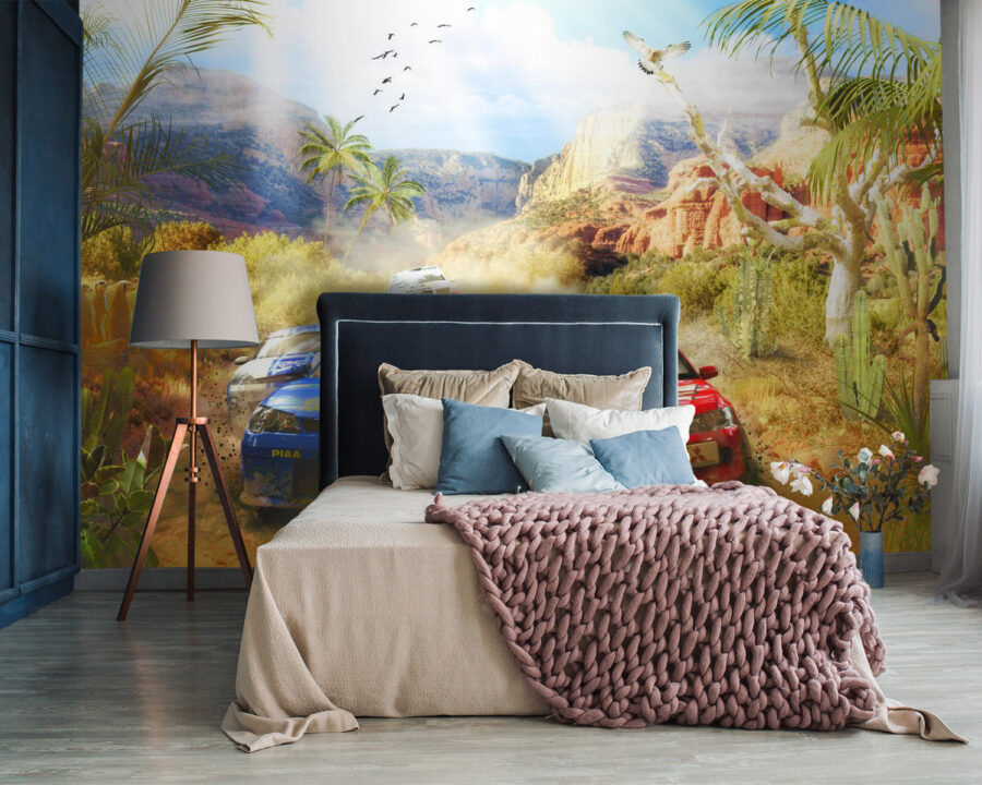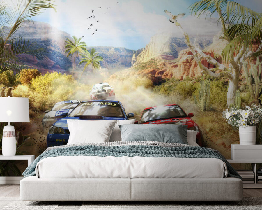 Představte si, že vejdete do svého dětského pokoje a ocitnete se v pouštním dobrodružství s rallye auty, která zvedají prach při průjezdu drsnými kaňony a kaktusy saguaro. Tato nástěnná malba není jen barevnou skvrnou – je to jako otevřít okno do napínavého závodu. Děti pocítí příval vzrušení, když si představí samy sebe za volantem, jak projíždí těmito zatáčkami. Není to jen o autech – je to o divoké svobodě pouště, kamarádství při závodě a čisté radosti z rychlosti. Je ideální pro malé dobrodruhy nebo závodní nadšence, určitě rozproudí fantazii a možná i vyvolá pár zvuků vroom vroom! A hele, není to jen pro děti – dospělí se možná také přistihnou, že sní o těch klikatých pouštních cestách.