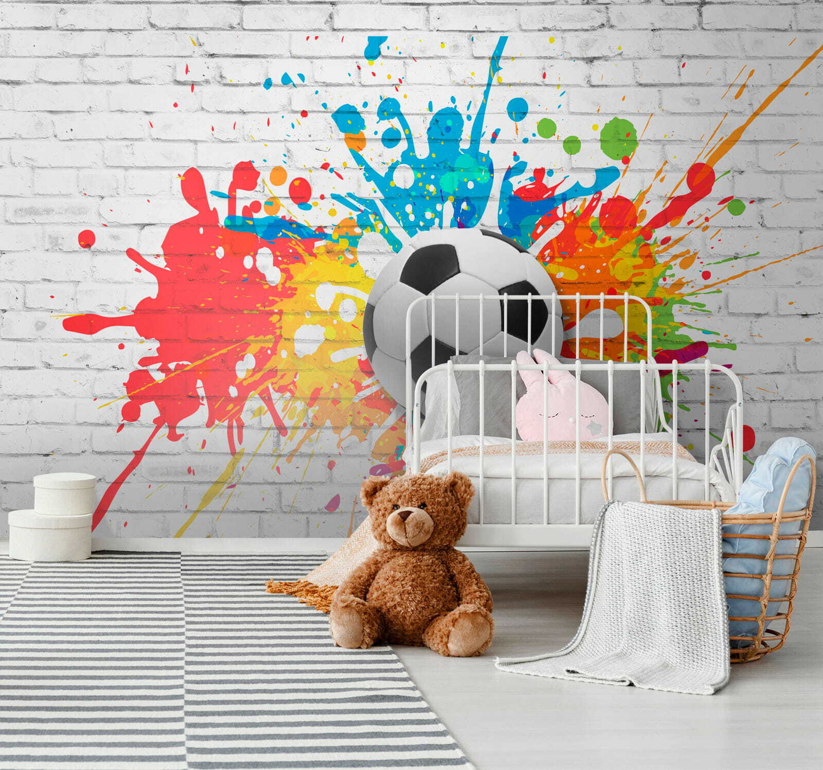 Představte si to – na bílé cihlové zdi se mísí živé barvy a uprostřed je klasický černobílý fotbalový míč. Jako by někdo vzal nejzajímavější gól na světě a zmrazil ho přímo ve vašem obývacím pokoji. Tato nástěnná malba je ideální do dětského pokoje, protože je v ní veškerá energie stadionového davu vměstnaná do jediné stěny. Odvážné barvy vystupují na pozadí jednobarevného míče a vytvářejí kontrast, který je hravý i výrazný. Je to 3D kouzlo, které oživuje hru! Představte si vzrušení na tváři vašeho dítěte, když vejde dovnitř a uvidí tohle – každodenní kulisu pro jeho sny o vstřelení vítězného gólu. Ať už hrají, nebo se jen tak poflakují, tato nástěnná malba jim vytvoří dokonalou kulisu.