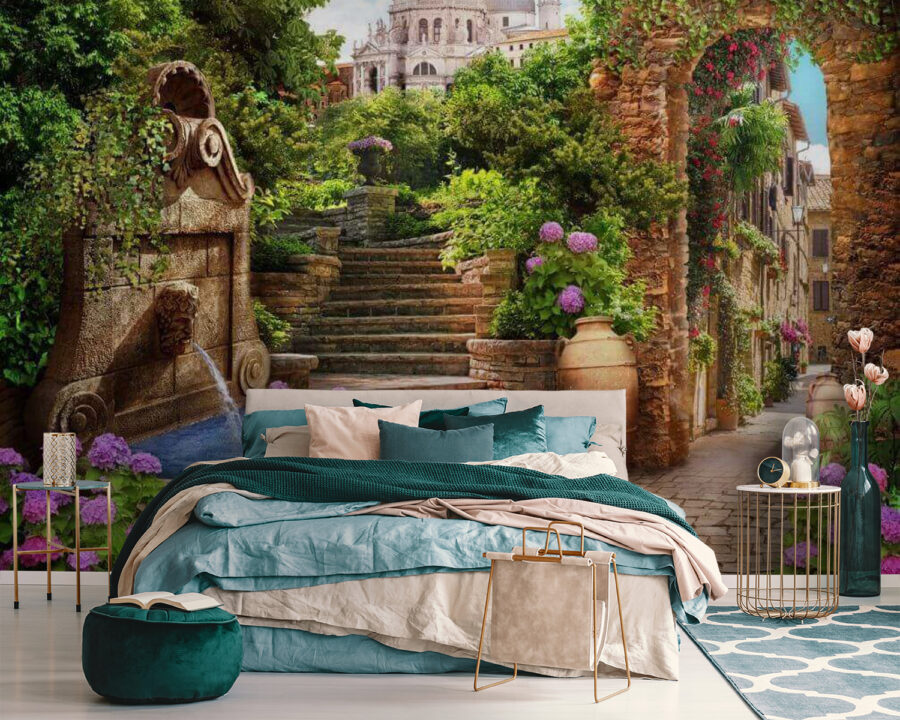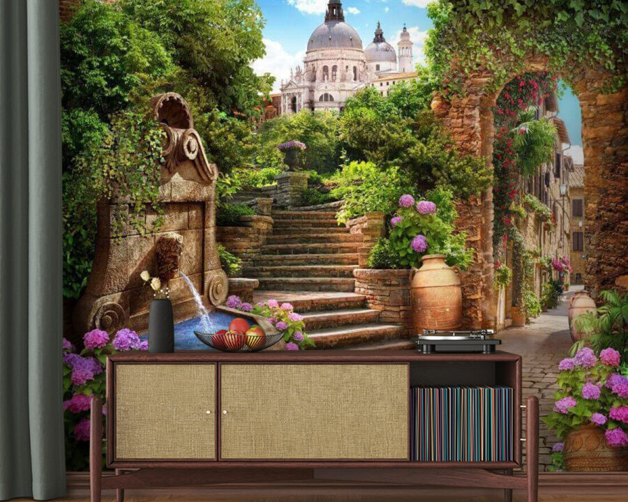 S touto okouzlující nástěnnou malbou s klidnou kamennou cestou, bublající fontánou a živými květinami proměníte jakýkoli prostor v zasněný únik. Představte si, že přímo z obývacího pokoje nebo ložnice vstoupíte do útulného evropského úkrytu. Díky uklidňujícím zvukům vody budete téměř slyšet jemné vlnění, zatímco barevné květy dodají scenérii radost. Je to jako najít skrytý kout malebné vesničky, který jen čeká na inspiraci k dalšímu dobrodružství. Dokonalá pro střípek šarmu, který vybízí ke snění při každém pohledu. Kdo by nechtěl popíjet kávu u této fontány? Je to hřejivost a rozmarnost v jednom nádherném kousku.