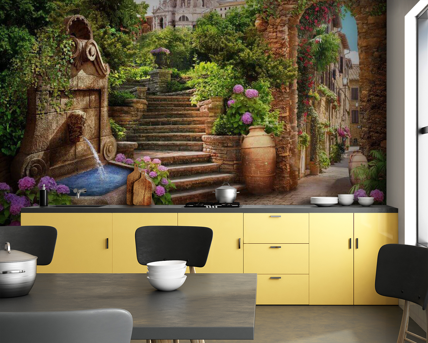 S touto okouzlující nástěnnou malbou s klidnou kamennou cestou, bublající fontánou a živými květinami proměníte jakýkoli prostor v zasněný únik. Představte si, že přímo z obývacího pokoje nebo ložnice vstoupíte do útulného evropského úkrytu. Díky uklidňujícím zvukům vody budete téměř slyšet jemné vlnění, zatímco barevné květy dodají scenérii radost. Je to jako najít skrytý kout malebné vesničky, který jen čeká na inspiraci k dalšímu dobrodružství. Dokonalá pro střípek šarmu, který vybízí ke snění při každém pohledu. Kdo by nechtěl popíjet kávu u této fontány? Je to hřejivost a rozmarnost v jednom nádherném kousku.