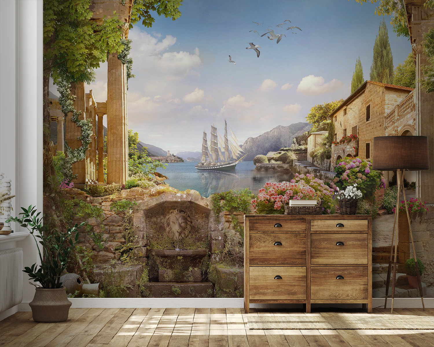 S touto úžasnou nástěnnou malbou s kamennou budovou u klidné vody se dostanete do zasněného úniku. Představte si to: sluncem políbené dny a jemný vánek, jak kolem proplouvá ladná loďka, zatímco barevné květiny se rozlévají po okrajích zestárlého kamene. Atmosféra? Čistý klid. Tato nástěnná malba přináší kus přírody do interiéru, takže se v každé místnosti budete cítit jako na útulném útěku. Přátelé se možná dokonce zeptají, zda jste svůj prostor proměnili v okouzlující přímořský únik! Je ideální pro vyvolání pocitů toulek, a přitom se můžete uvelebit doma. Proměňte své stěny a nechte dobrodružství začít!