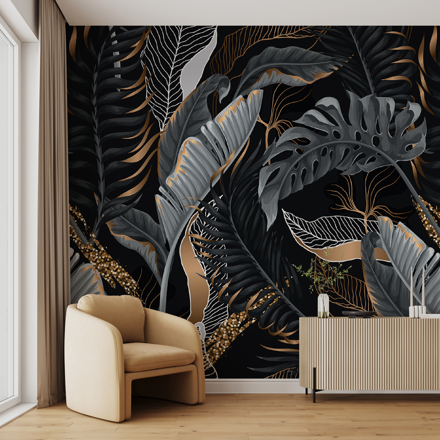Proměňte svůj prostor pomocí této úžasné nástěnné malby s elegantními tropickými listy na tmavém pozadí. Představte si, že se každý den probouzíte obklopeni touto svěží zelení, jako byste vstoupili do klidného lesa – no, bez brouků! Je ideální pro vytvoření příjemné a útulné atmosféry. Představte si líné víkendy, kdy popíjíte kávu a kocháte se krásou těchto složitých listů. Kontrast tmavého a světlého dodává dramatičnost, aniž by vás ohromil; je to, jako by se příroda rozhodla uspořádat malý elegantní večírek přímo na vaší zdi. Skvěle se hodí do obývacího pokoje, ložnice nebo do klidného čtecího koutku, který prostě potřebuje trochu víc atmosféry. Proč se spokojit s obyčejnou barvou, když si můžete dopřát mini džunglový únik?