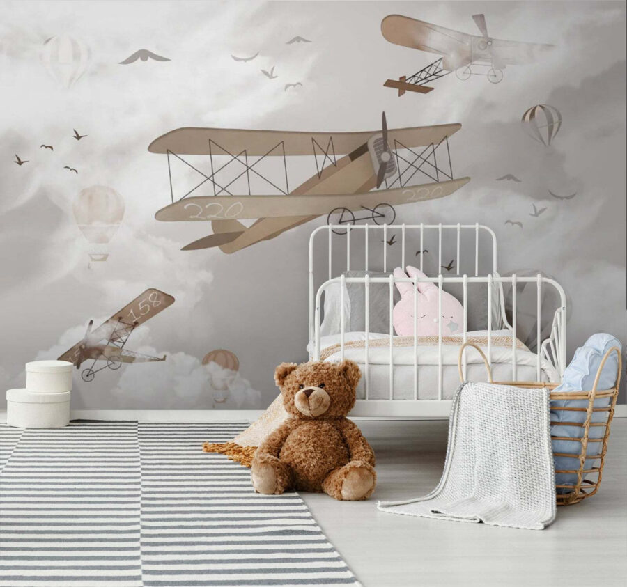 Představte si, že se vznášíte vysoko nad mraky s touto okouzlující nástěnnou malbou “Horkovzdušný balón v oblacích”. Tato nástěnná malba je ideální do dětských pokojů nebo pro každého mladého člověka, protože její náladový design představuje horkovzdušné balóny a historická letadla tančící mezi mraky – naprosto snový! Představte si, že se každý den probouzíte s tímto výjevem, jako byste byli na nekonečném dobrodružství.