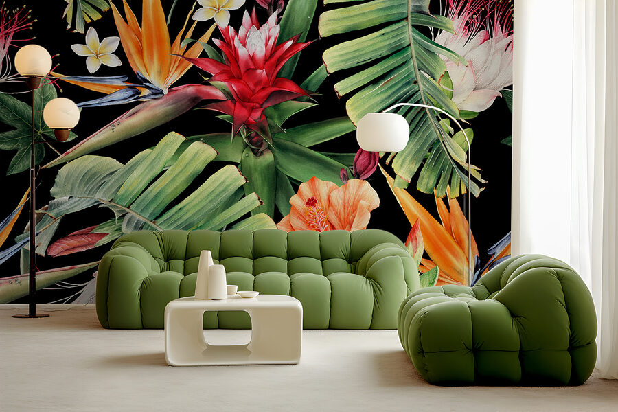 Proměňte svůj prostor v tropický ráj pomocí této živé nástěnné malby. Představte si, že vstoupíte do džungle plné výrazných barev, kde se ohnivě červené květy mísí se svěžími listy, a to vše na elegantním černém pozadí. Jako byste si přinesli kousek sluncem zalitého útěku přímo do svého obývacího pokoje. Přátelé se u vás zastaví a budou si myslet, že jste profesionální dekoratér – nebo možná jen tajný botanik! Veselé květiny navíc dokážou zvednout jakoukoli náladu a vytvářejí šťastnou, příjemnou atmosféru. Je ideální na akcentní stěnu nebo na místo, které potřebuje dodat osobnost. Kdo by se nechtěl každý den cítit jako na dovolené? Ponořte se do tohoto živého vzoru a sledujte, jak vaše stěny ožívají!