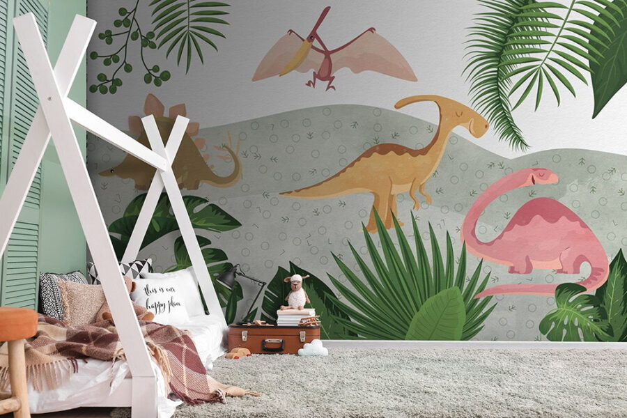 Proměňte dětský pokoj v dinosauří ráj s touto okouzlující nástěnnou malbou „Skupina dinosaurů s listy“. Představte si malé průzkumníky, jak vzhlížejí k hravým býložravcům a drzému létajícímu pterosaurovi – jejich fantazie se rozběhne na plné obrátky! Je to víc než jen nástěnná malba, je to příběh, který čeká na zvědavou mysl, aby se rozvinul. Každý dinosaurus vypadá téměř jako živý, připravený vrhnout se do akce. Uklidňující zelené a jemné pastelové tóny dodávají poklidu, jako malý kousek prehistorického ráje. Tato tapeta není jen dekorací, je to pozvánka k dobrodružství a špetka radosti v každé místnosti. Perfektní pro inspiraci kreativity, a přiznejme si to – kdo by nechtěl vstávat s přátelskými dinosaury?