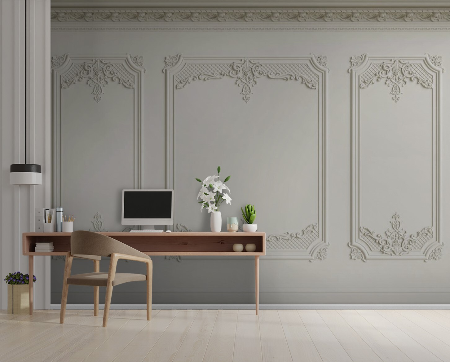 Proměňte svůj prostor pomocí okouzlující nástěnné malby “Bílé dveře s bílým rámem”. Představte si, že vstoupíte do místnosti, která svým boiserie efektem našeptává eleganci a působí útulně i sofistikovaně. Představte si, jak jemný, složitý vzor přitahuje pohled a dodává pocit hloubky a šarmu, aniž by zahlcoval smysly. Je ideální pro prázdnou stěnu, která potřebuje jen náznak dramatu. Přátelé si ji možná dokonce spletou se skutečnou architekturou. Kdo by neměl rád dobré povídání o kousku, který mu dodá šmrnc? Je to jako pozvat si domů umělce, aniž byste řekli jediné slovo.