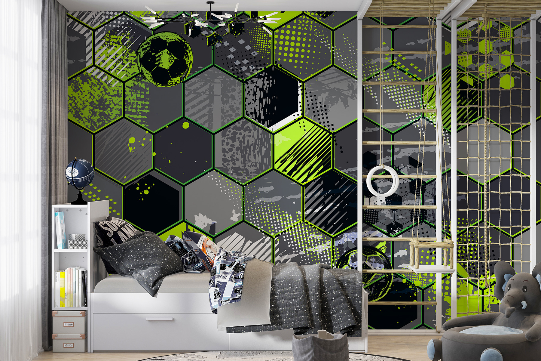 Vzor má v sobě veselý šestiúhelník se stříkanci neonově zelené a elegantní šedé. Je to, jako by se fotbalové hřiště srazilo s moderním uměním. Ideální pro každého, kdo má rád ve svém dekoru špetku zábavy a šmrnc. Není to jen tapeta – je to prohlášení. Představte si to: probudíte se, vezmete si kávu a pokaždé, když kolem ní projdete, zažijete ten malý záchvěv štěstí. Skvělý začátek konverzace pro všechny ty případy, kdy k vám přijdou přátelé a zeptají se: “Kde jsi to vzal?”.