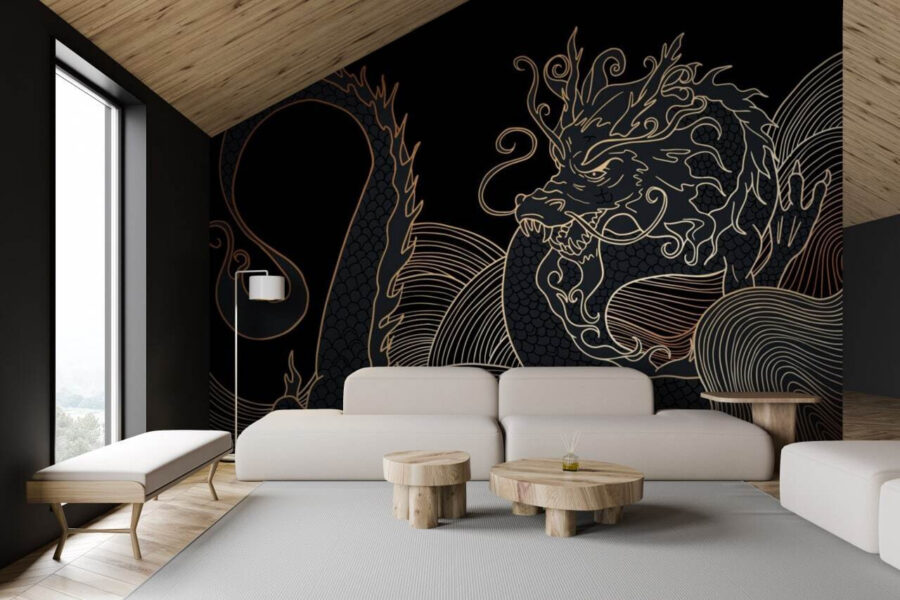 Ponořte se do světa zázraků s nástěnnou malbou “Mystický drak povstává v děsivé temnotě”. Představte si draka vinoucího se tajemnými vlnami, jehož divoký pohled a složité vzory vás vtáhnou přímo do jeho příběhu. Tento výrazný kus dodá vzrušující atmosféru každému prostoru, ať už jde o útulný čtenářský koutek nebo živý obývací pokoj.