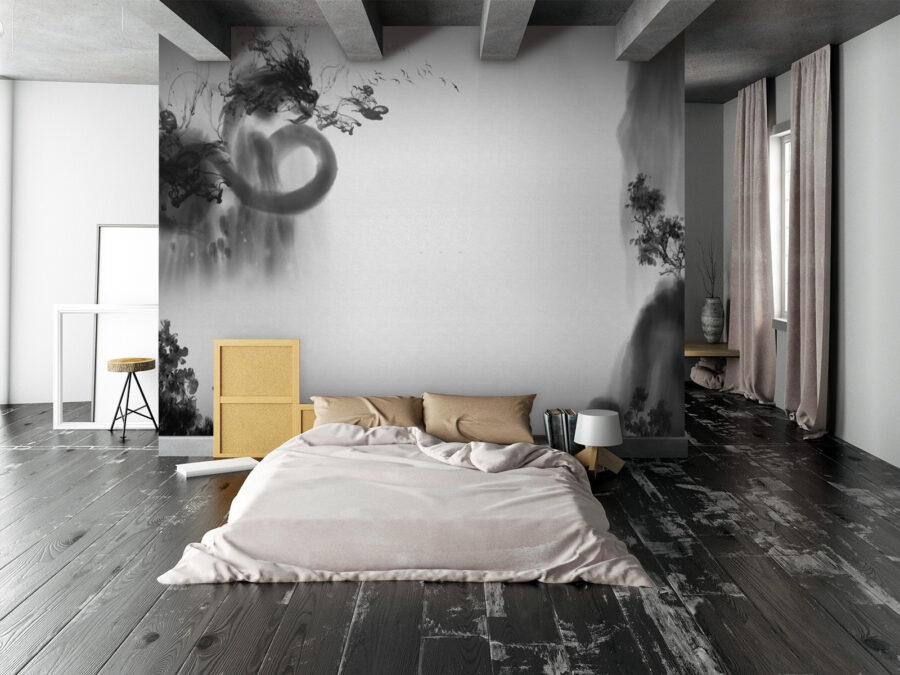 Podívejte se na tuto skvělou černobílou nástěnnou malbu! Je to něco jako směs klasiky a umění. Představte si, že vejdete do místnosti a přivítá vás tato tajemná, téměř snová scéna. Má takový vzhled, který vás přiměje přemýšlet o kouřovém inkoustu vířícím na papíře, s náznaky krajin a abstraktních forem, které se mísí dohromady.