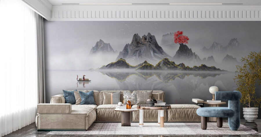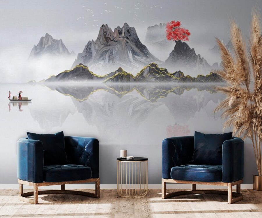 Proměňte jakýkoli pokoj pomocí této úchvatné tapety, na které je vyobrazeno majestátní pohoří a nápadný červený strom na pozadí klidné vodní plochy. Je to jako mít klidné útočiště přímo ve svém domě. Představte si, jak si s šálkem čaje užíváte pohodu a necháváte se unášet klidnou scenérií.