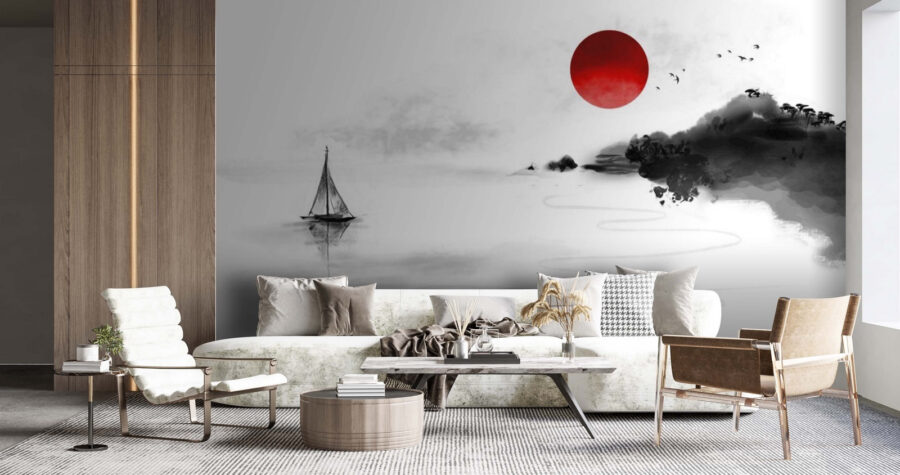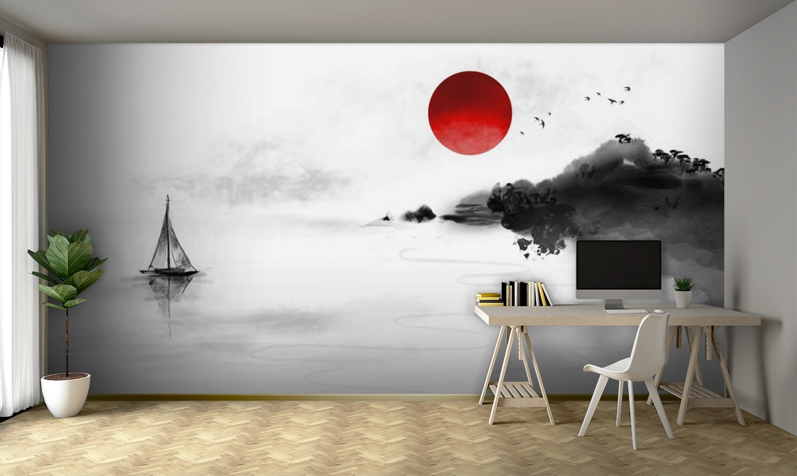 Představte si, že vejdete do místnosti a přivítá vás taková klidná scéna – tato zasněná nástěnná malba zobrazuje červený kruh na klidném bílém pozadí. Je to jako váš vlastní malý kousek zenového umění. Odvážné červené slunce nápadně vyniká a nabízí spršku oživující barvy, kterou je těžké ignorovat. Když se k tomu přidá jemná, mlhavá krajina, vznikne dokonalá rovnováha mezi klidem a živostí.