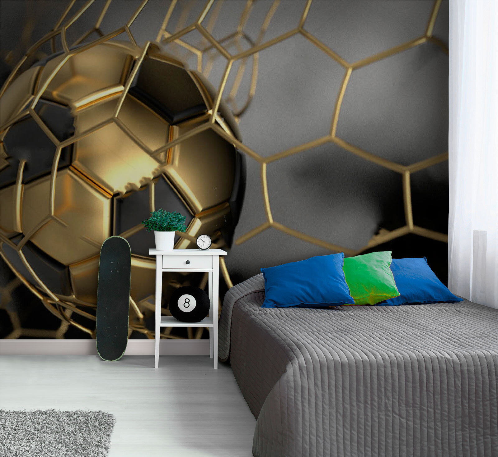 Představte si, že vejdete do místnosti a bum! Přivítá vás tato úžasná nástěnná malba fotbalového míče chyceného přímo v síti – to je gól v domácím dekoru! “Fototapeta Fotbalový míč chycený v síti” zachycuje čisté vzrušení z vítězné trefy, zmrazené v čase. Ideální do všech prostor, kde se scházejí vášniví fanoušci fotbalu. Dětské pokoje, pánské jeskyně, dokonce i obývací pokoj, pokud je vaše rodina stejně fotbalově poblázněná jako ta naše. Je to víc než jen tapeta, je to jako mít na displeji svůj osobní sportovní vrchol, který do vašeho prostoru vnese energii a vzrušení. Při každém pohledu na ni téměř uslyšíte řev davu a pocítíte ten nával adrenalinu – možná si dokonce nacvičíte vlastní vítězný tanec. Je odvážný, dynamický a zaručeně se o něm bude mluvit. Vneste do svého života trochu sportovního koření; jen tak dál, vstřelte ten dekorační hattrick!