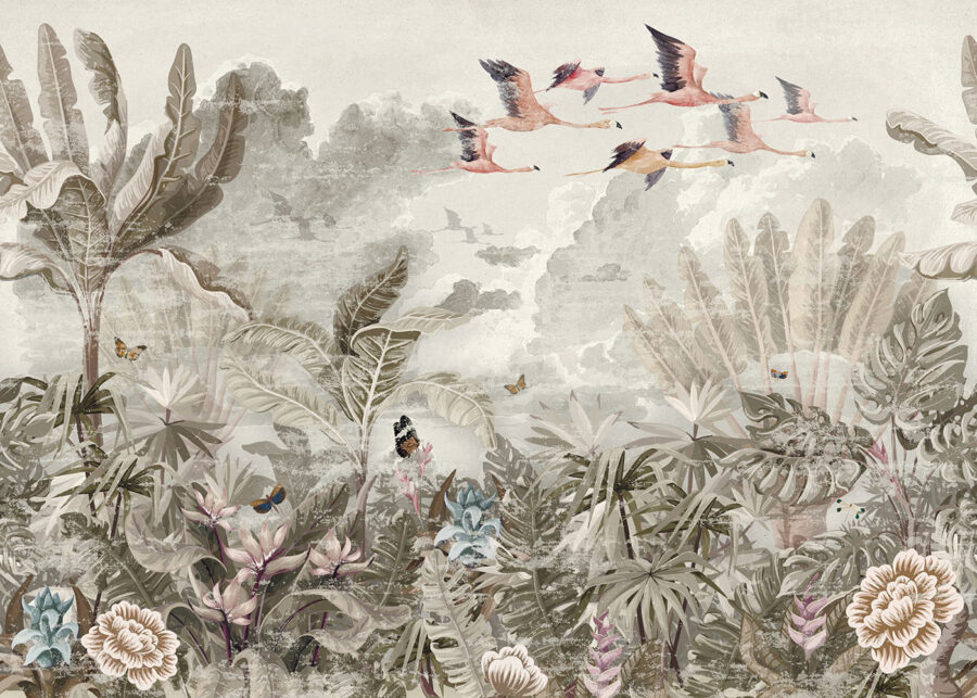 Představovali jste si někdy plameňáky plachtící nad svěží zelenou džunglí? Tato nástěnná malba to dokáže. Barvy jsou jemné, ale přesto působivé, jako chladné ráno po mrholení. Ti růžoví plameňáci – nejsou prostě kouzelní? Přinášejí pocit svobody a ladnosti, vznášejí se nad palmovými listy a divokou flórou. Je to jako vstoupit do exotické říše divů pokaždé, když vstoupíte do místnosti. Ideální pro dodání trochy dobrodružství a klidu do vašeho prostoru, nemyslíte? Tato nástěnná malba je dokonalou kombinací divokosti a klidu, která je prostě… správná. Dá se říct, že je to skutečně podnět ke konverzaci!