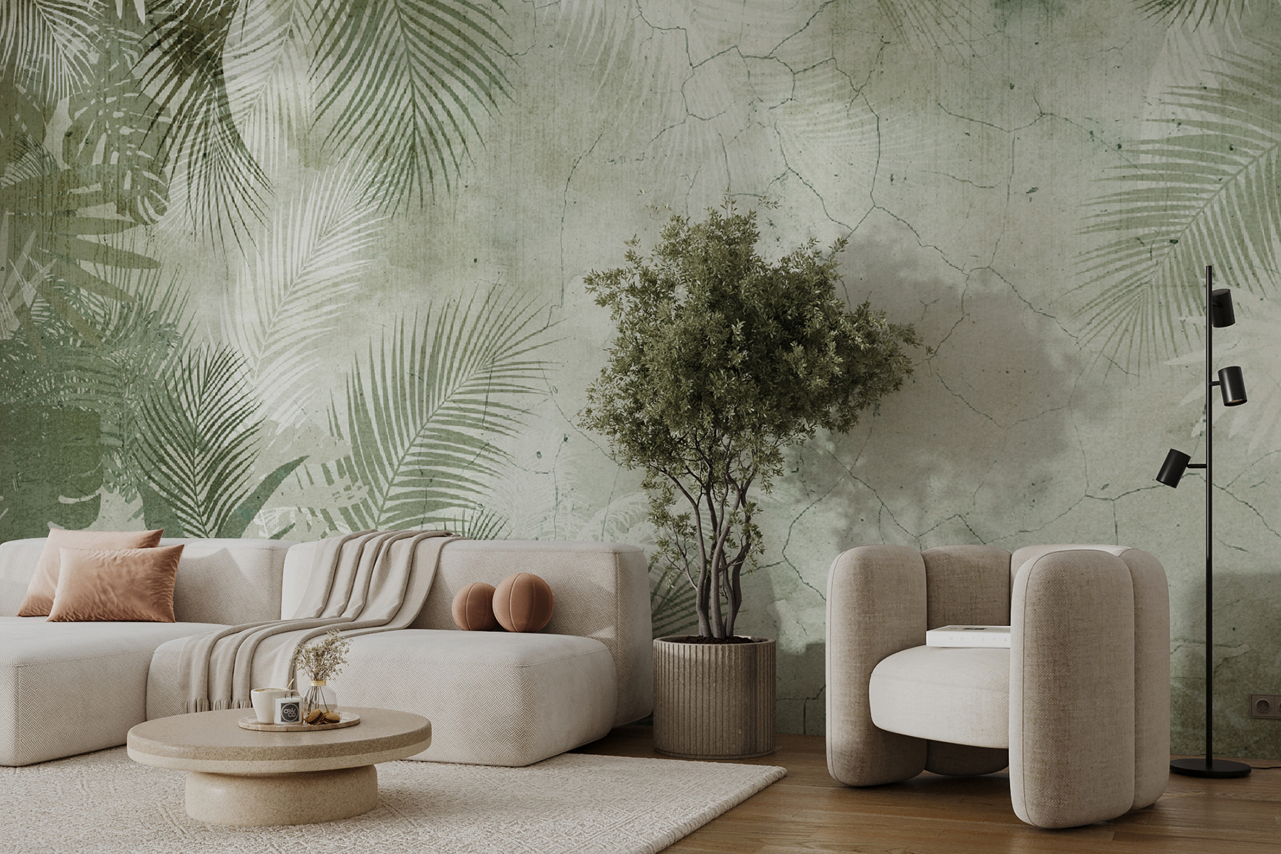Proměňte svůj prostor pomocí této nádherné nástěnné malby s tropickými listy rozprostřenými na měkkém texturovaném pozadí. Představte si, že vejdete do místnosti, která okamžitě připomíná bezstarostný útěk do ostrovního ráje – je to jako přenést do interiéru kousek přírody. Jemná zeleň a zemité tóny vytvářejí příjemnou atmosféru, díky níž si možná budete připadat, jako byste leželi pod palmami. Tato nástěnná malba, která se skvěle hodí do útulného čtecího koutku nebo do živého obývacího pokoje, vybízí k chvilkám odpočinku a inspiruje ke snění o dobrodružstvích zalitých sluncem. Oživte své stěny a nechte ve svém domově rozkvést uklidňující esenci tropů. Kdo by řekl, že to všechno dokáže nástěnná malba?