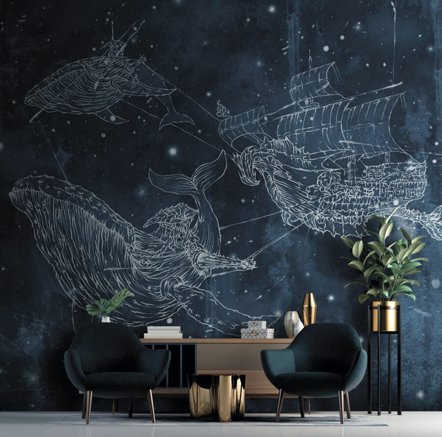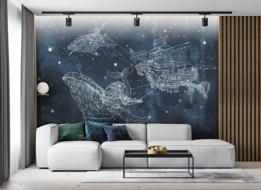 Představte si, že se probudíte a ze zdi vám bude zpívat velryba! Tato nástěnná malba “Kresba velryby” je jako ponoření do kouzelného moře – není to obyčejná dekorace na zeď. Je ideální pro děti, které sní o mořských dobrodružstvích, i pro dospělé s mladým srdcem, kteří chtějí do svého prostoru přidat kapku oceánského zázraku. Směs hvězd, velryb a tajemné lodi proplouvá soumračnou modří a vytváří rozmarnou noční krajinu. Je to jako oživlá pohádka na dobrou noc. Nechte se touto okouzlující scénou unést do říše snů nebo se nechte unášet jakýmkoli pokojem na vlně kreativity a zázraků. Odplujte!