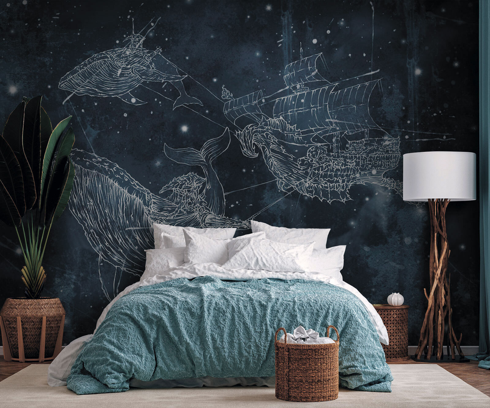 Představte si, že se probudíte a ze zdi vám bude zpívat velryba! Tato nástěnná malba “Kresba velryby” je jako ponoření do kouzelného moře – není to obyčejná dekorace na zeď. Je ideální pro děti, které sní o mořských dobrodružstvích, i pro dospělé s mladým srdcem, kteří chtějí do svého prostoru přidat kapku oceánského zázraku. Směs hvězd, velryb a tajemné lodi proplouvá soumračnou modří a vytváří rozmarnou noční krajinu. Je to jako oživlá pohádka na dobrou noc. Nechte se touto okouzlující scénou unést do říše snů nebo se nechte unášet jakýmkoli pokojem na vlně kreativity a zázraků. Odplujte!