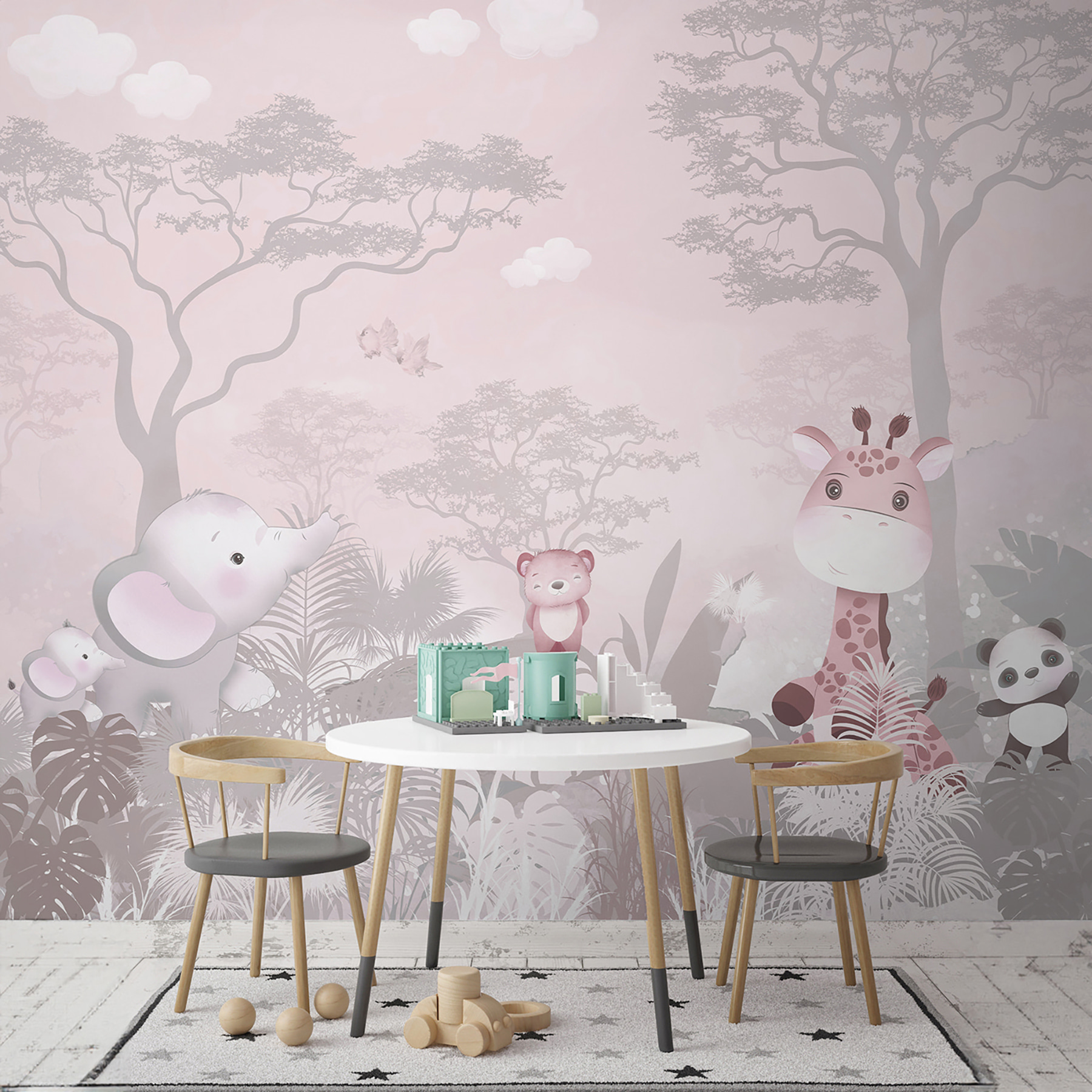 Představte si to: vaše dítě se každé ráno probudí s veselým růžovým medvídkem, zasněnou žirafou a pandou – to je způsob, jak začít den! Ať už proměňujete dětský pokoj, hernu, nebo dokonce dodáváte šarm pokoji teenagera, tato nástěnná malba přináší nekonečné úsměvy. Jako by stěny šeptaly jemná dobrodružství a podněcovaly fantazii k rozletu.