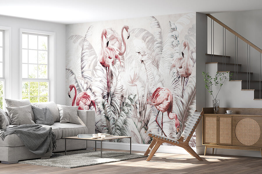 Ať už se jedná o obývací pokoj, ložnici, nebo dokonce kreativní kancelářský prostor, tato nástěnná malba dodá hravý a zároveň sofistikovaný nádech. Jemné pastelové odstíny se bez námahy mísí s odvážnou plameňákově růžovou, takže celá scéna působí jako klidné snění.