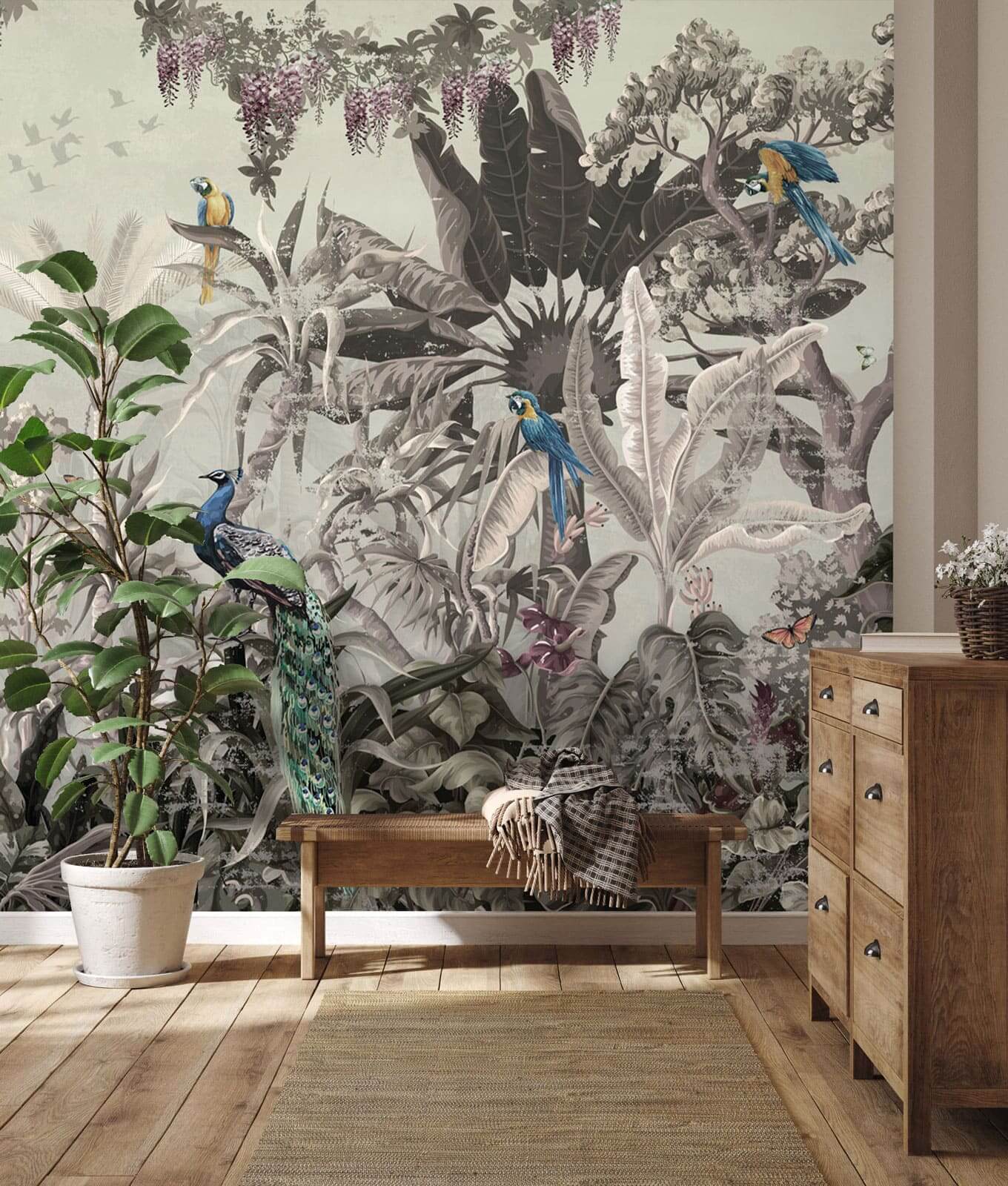 Transform your space into a serene jungle escape with this captivating mural of birds and plants. Picture it now: every time you walk by, you’re greeted by vibrant parrots and majestic peacocks, as if they’re inviting you to join their tropical soirée. The lush greenery brings a refreshing touch, perfect for daydreaming with a cup of tea. Imagine sipping your morning coffee while lost in the beauty of that scenery. It’s like a mini-vacation right in your living room—just without the mosquitoes! Whether it’s a cozy nook or a home office that needs a lift, this mural whispers, “Relax, you’re in paradise.”