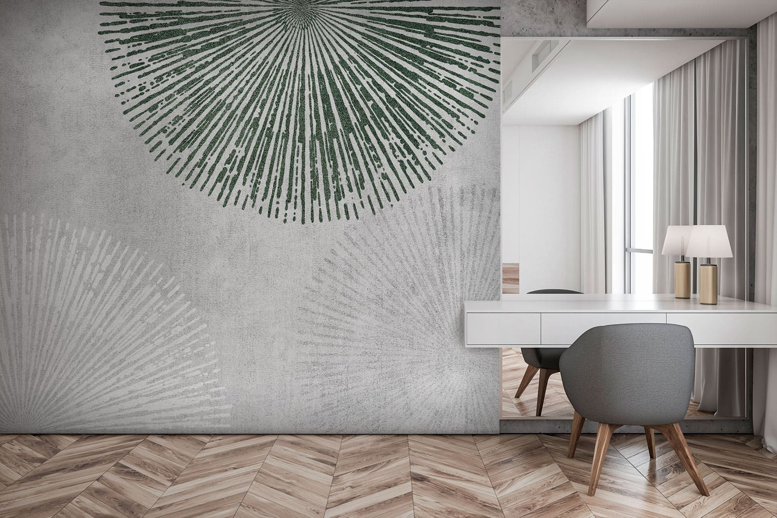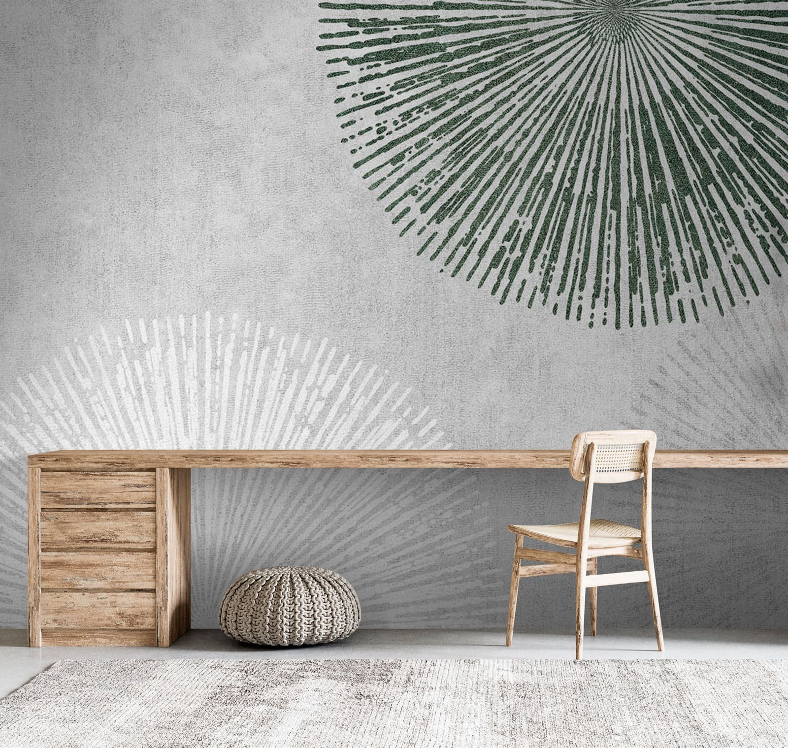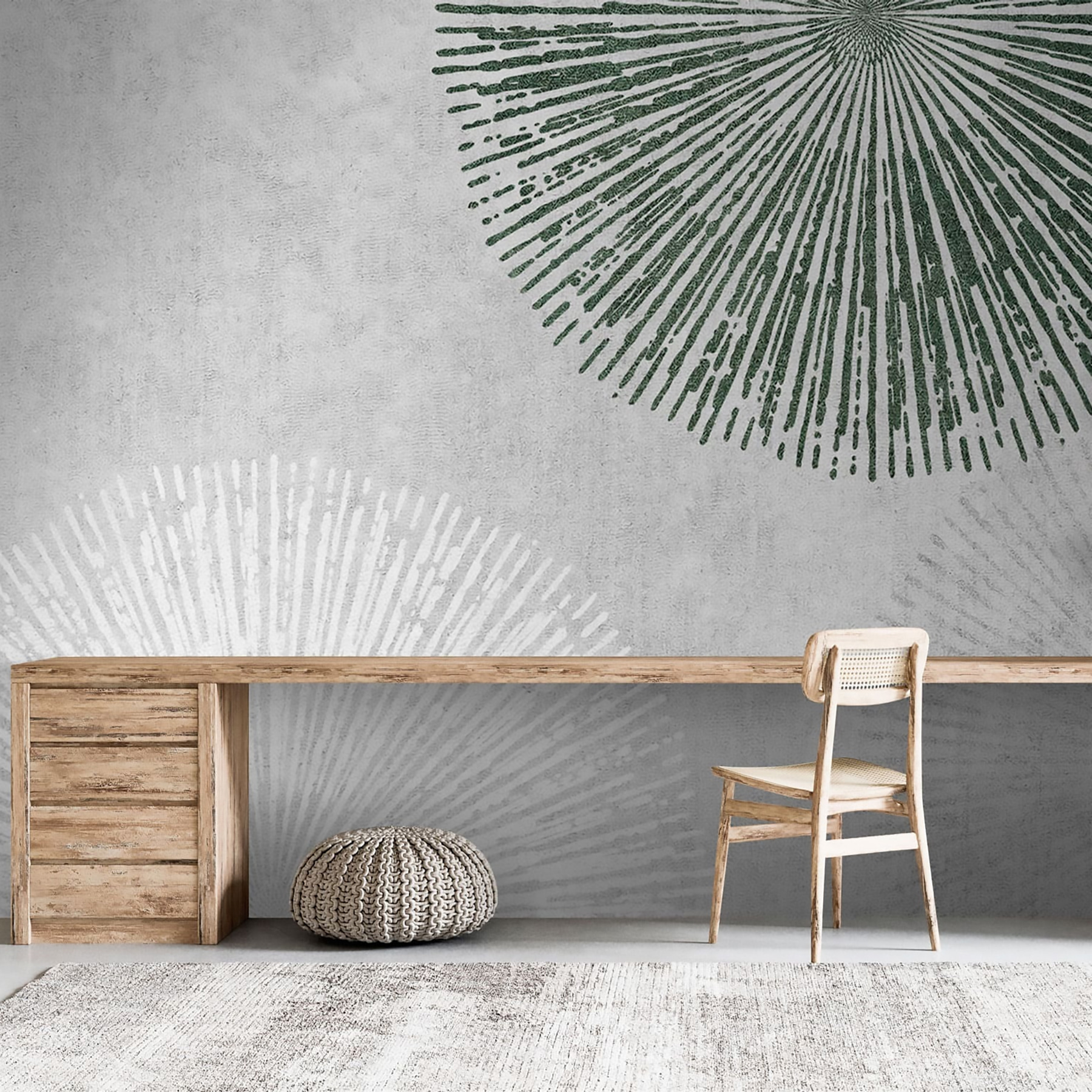 Proměňte svůj prostor pomocí této úchvatné nástěnné malby s hravými radiálními vzory na jedinečném pozadí. Představte si to: obývací pokoj, který najednou nevypadá jako starý mládenecký byt vašeho bratrance, ale jako umělecká kavárna ve městě. Měkká zelená a bílá vytvářejí klidnou atmosféru, díky níž si snadno odpočinete po dlouhém dni. Hosté budou zvědaví a zvědaví. Je to jako flirtovat s geometrií – odvážný, zábavný, a přitom lehce stylový. Možná se přistihnete, že se při pohledu na něj zasníte a každý malý detail podnítí vaši představivost. Ideální pro ty, kteří chtějí elegantní vzhled bez zbytečného rozruchu.