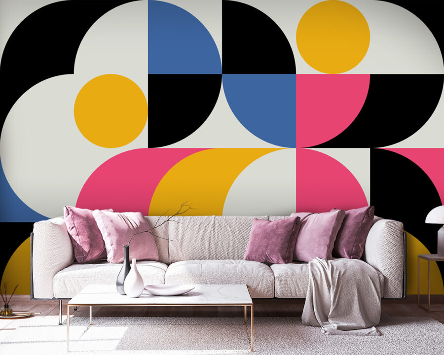 Podívejte se na tuto živou nástěnnou malbu s názvem “Žlutý kruh na šedém pozadí”. Je to, jako by se muzeum moderního umění rozhodlo nastěhovat k vám domů! Odvážné žluté kruhy vystupují proti šedé a vytvářejí ohromující ústřední bod. Přidejte stříkance modré, růžové a černé barvy a máte na stěně večírek jako konfety zamrzlé v čase.