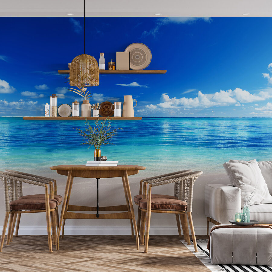 Snili jste někdy o kousku ráje přímo ve svém obývacím pokoji? Tato nástěnná malba s příznačným názvem “Modrá obloha s mraky” by mohla být právě pro vás. Představte si, že se podíváte z pohovky a okamžitě se přenesete na klidné mořské pobřeží – jemné vlny šplouchají a azurová obloha je posetá nadýchanými mraky. Je to jako mini dovolená pokaždé, když se podíváte na zeď. Ideální pro dodání nádechu klidu jakémukoli prostoru, ať už jde o útulný čtecí koutek nebo rušnou jídelnu. Představte si, jak k vám přijdou přátelé a okamžitě pocítí ten ahhhh moment, jako by vstoupili do plážové kabiny. Nadechněte se, vydechněte a nechte se unášet klidem – písek v botách není potřeba!
