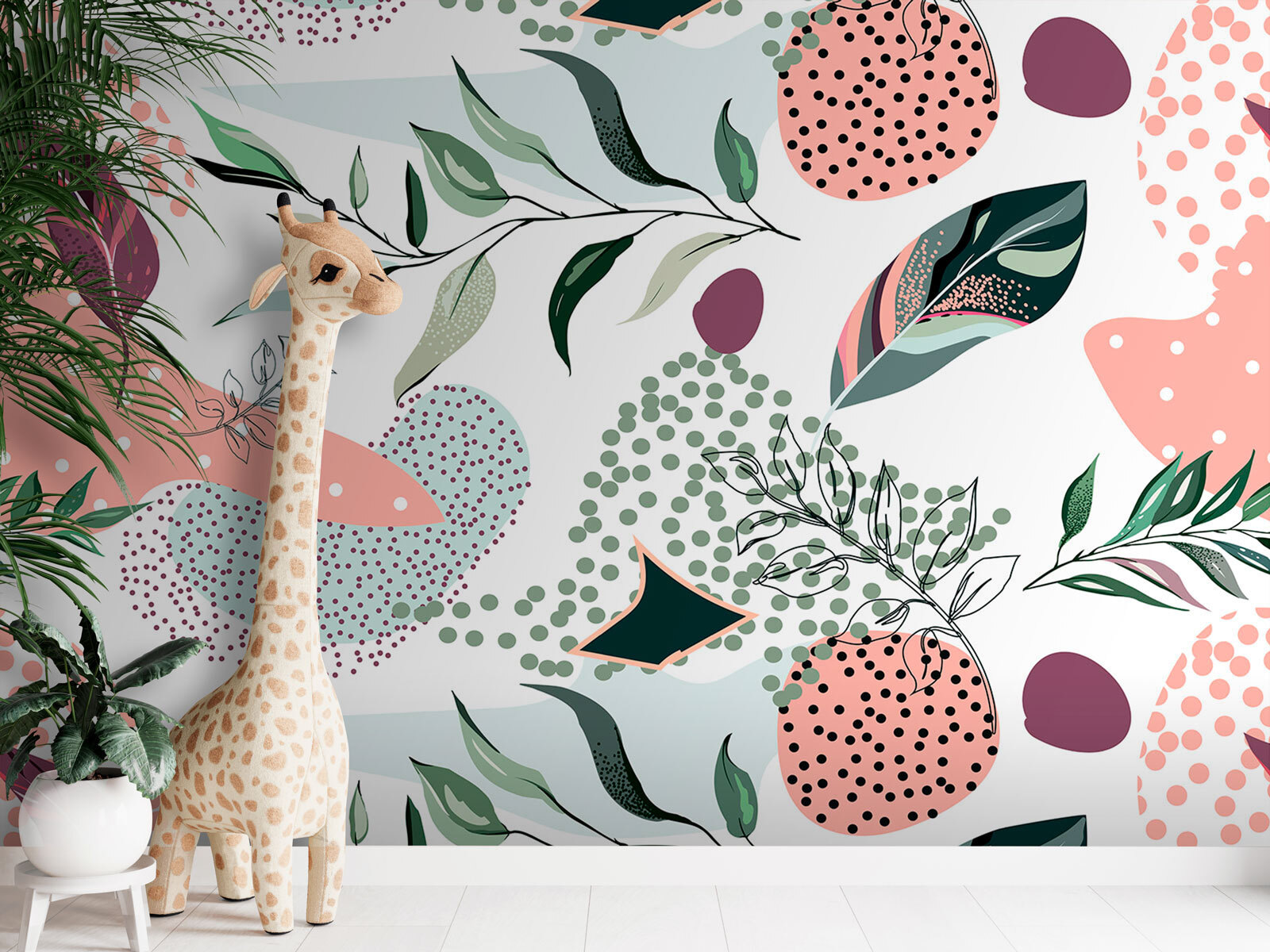 Už jste někdy viděli nástěnnou malbu a měli jste pocit, že do místnosti přináší závan čerstvého vzduchu? Přesně to dělá tento vzor Abstract Leaves and Dots. Je to hravý tanec listů a rozmarných teček, který je ideální pro rozproudění radosti v dětském pokoji. Představte si, že se vaše dcera probudí s tímto veselým souborem pastelových tvarů, který jí okamžitě rozjasní ráno. Nebo váš syn může snít o dobrodružstvích mezi abstraktními listy.